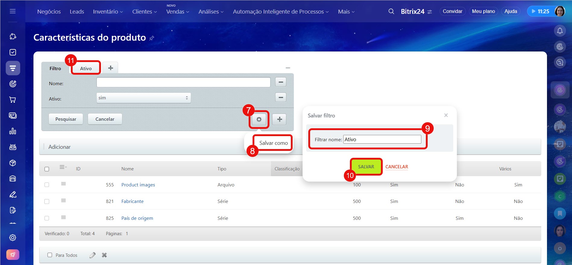 7–10. Salve o filtro para não precisar especificar os parâmetros de busca novamente a cada vez. Clique em Configurações (⚙️) > Salvar como, especifique o nome e clique em Salvar.