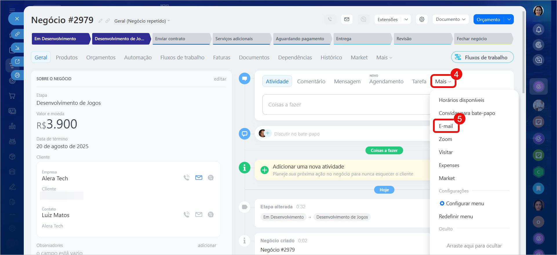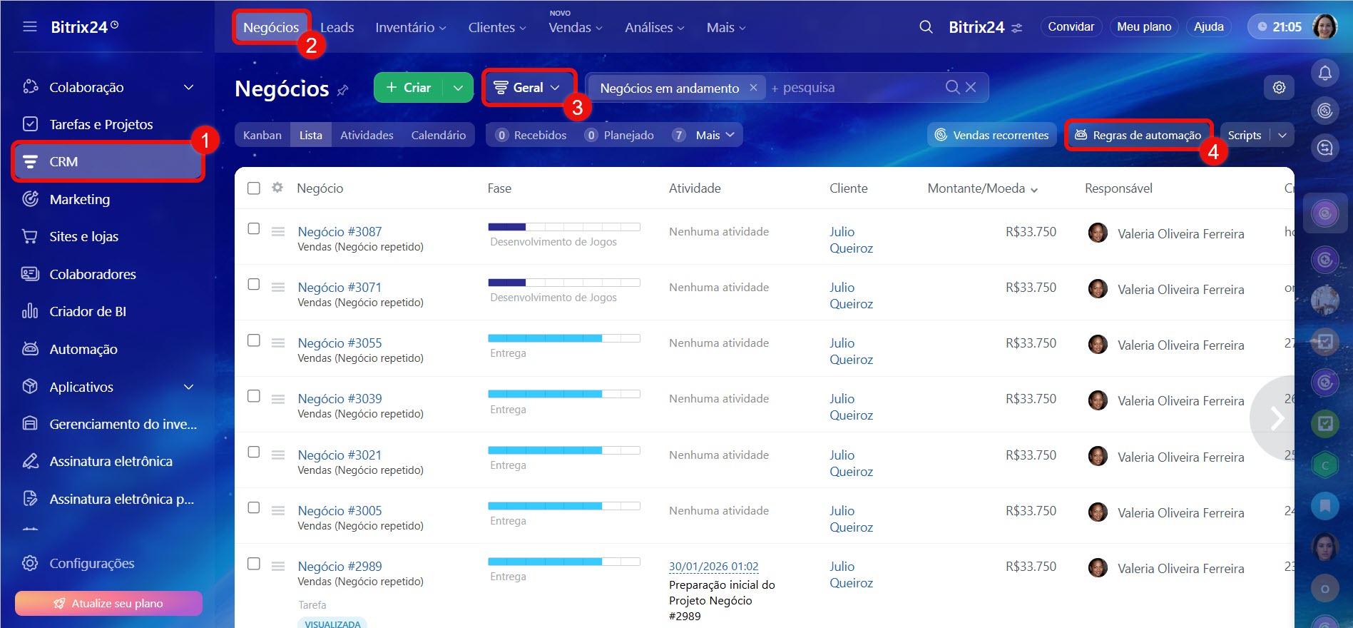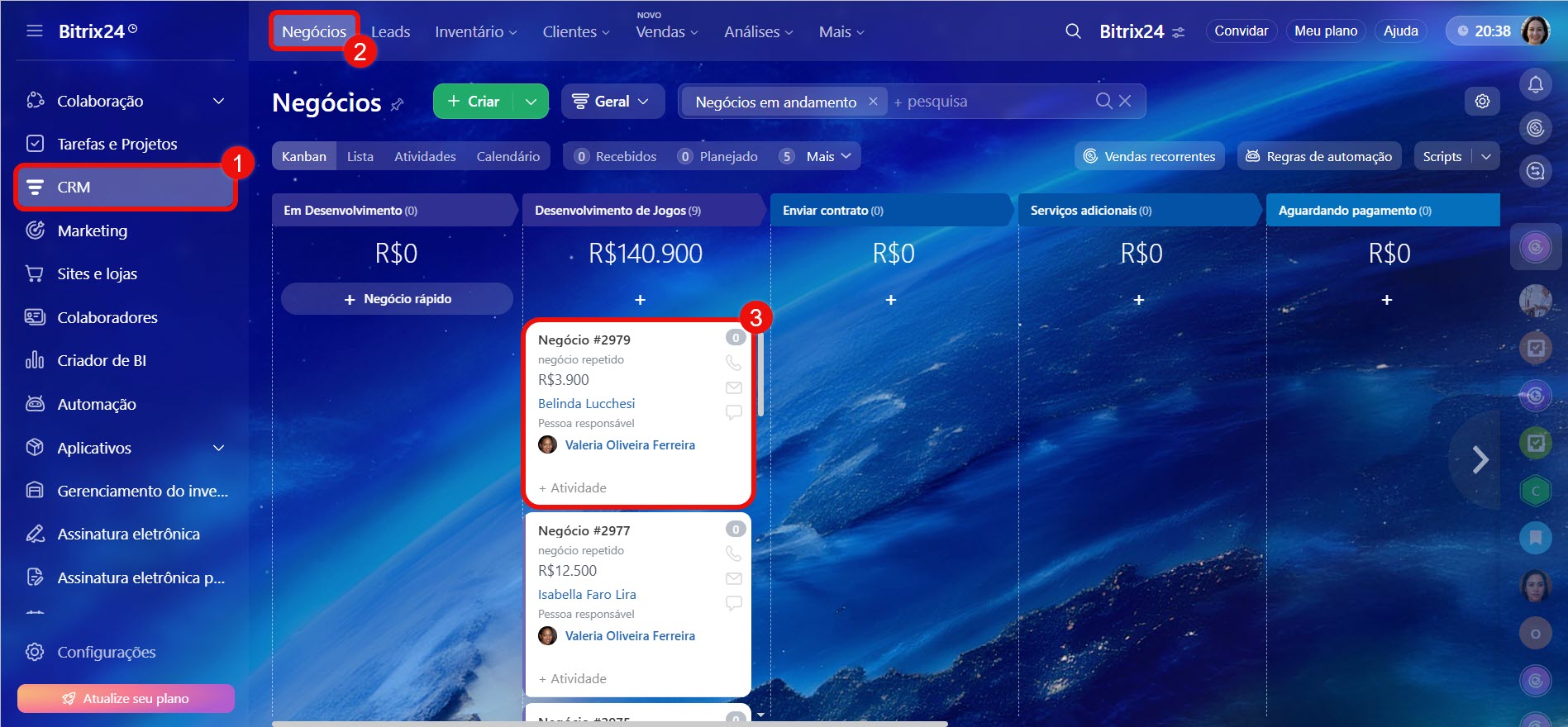 1–3. Acesse CRM > Negócios e abra qualquer registro.