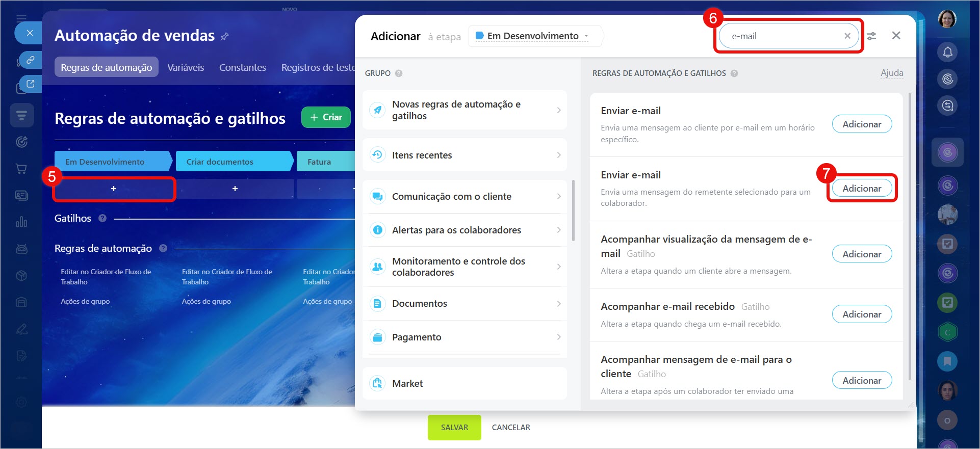 6–7. Na barra de pesquisa, digite Enviar e-mail para colaborador. Adicione a regra — uma janela de configuração será aberta.