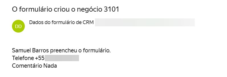 Quando um cliente preenche o formulário, seus dados são salvos no CRM. Na seção correspondente do CRM, um registro será criado, e a regra de automação enviará um e-mail com os dados desse registro para o colaborador.