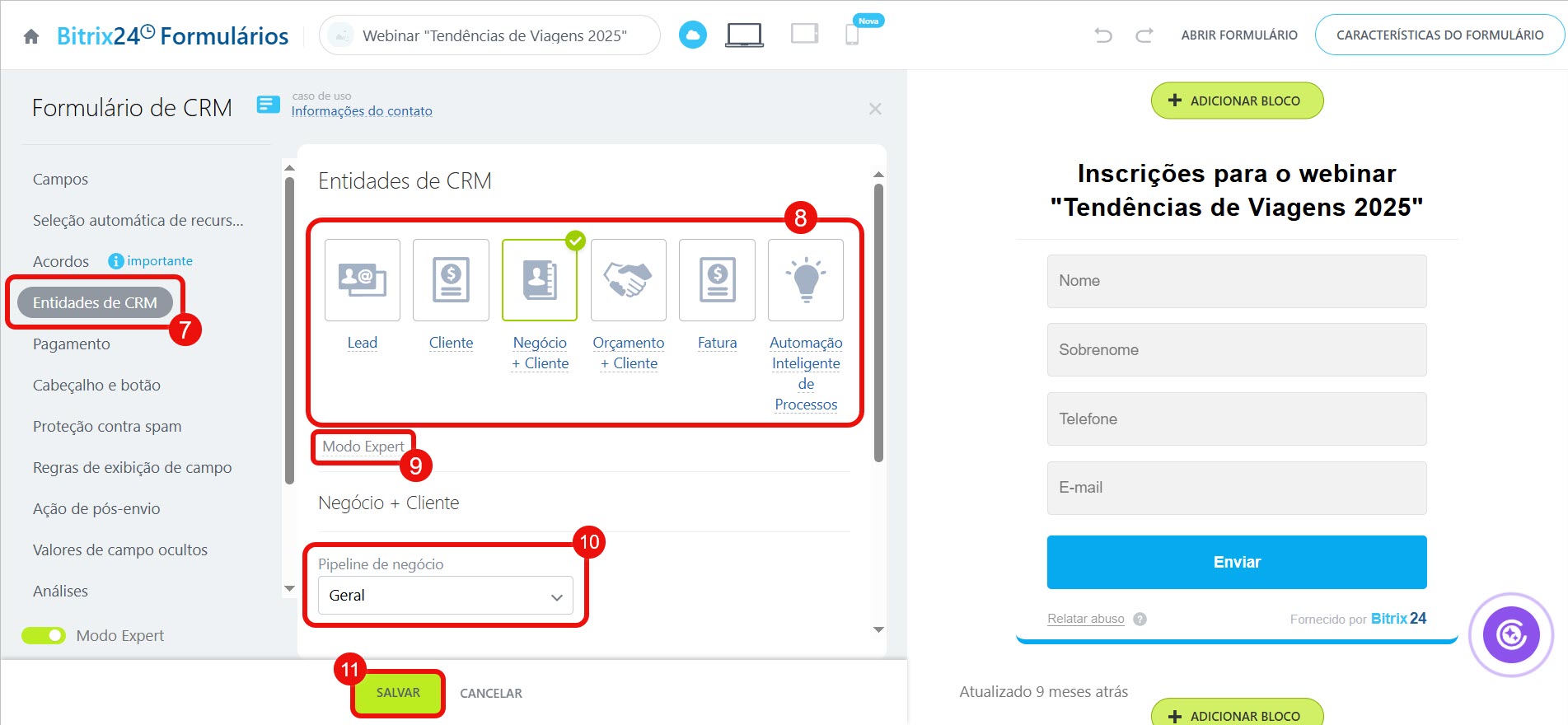 7–8. Na aba Elementos no CRM, selecione quais registros serão criados no CRM quando o cliente preencher o formulário: Lead, Negócio + Cliente, Orçamento + Cliente, Fatura ou Processo inteligente.