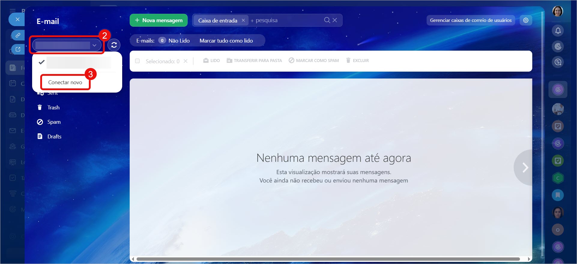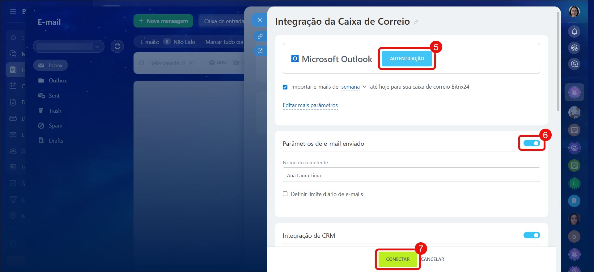 Para envio de e-mails, você pode conectar uma caixa na seção E-mail ou usar a opção Configurar Remetente.