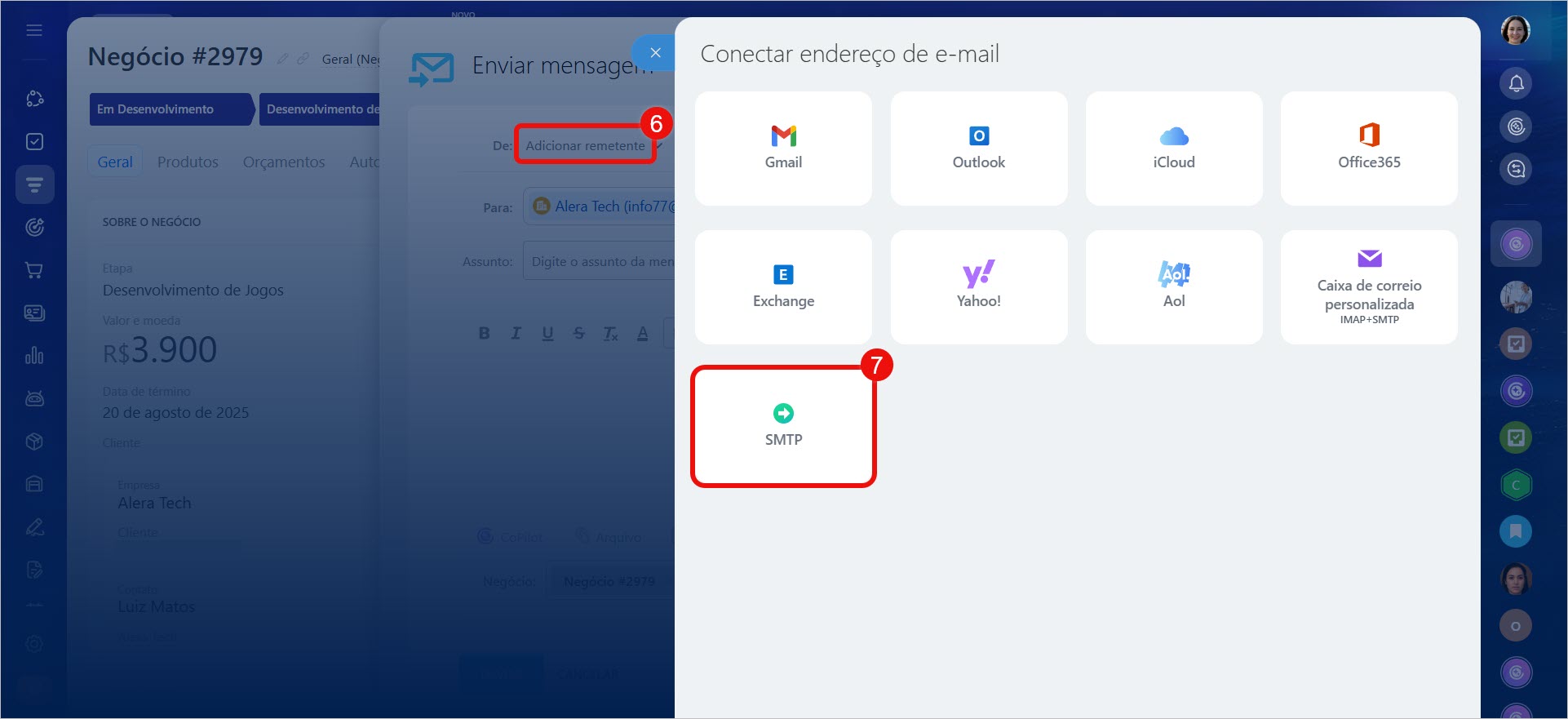 Opção "Configurar Remetente". Conecte uma caixa de e-mail via servidor SMTP para envio. Ela não aparecerá na seção E-mail e estará disponível apenas na lista de remetentes. A configuração está disponível nas seções E-mail, CRM e Marketing.