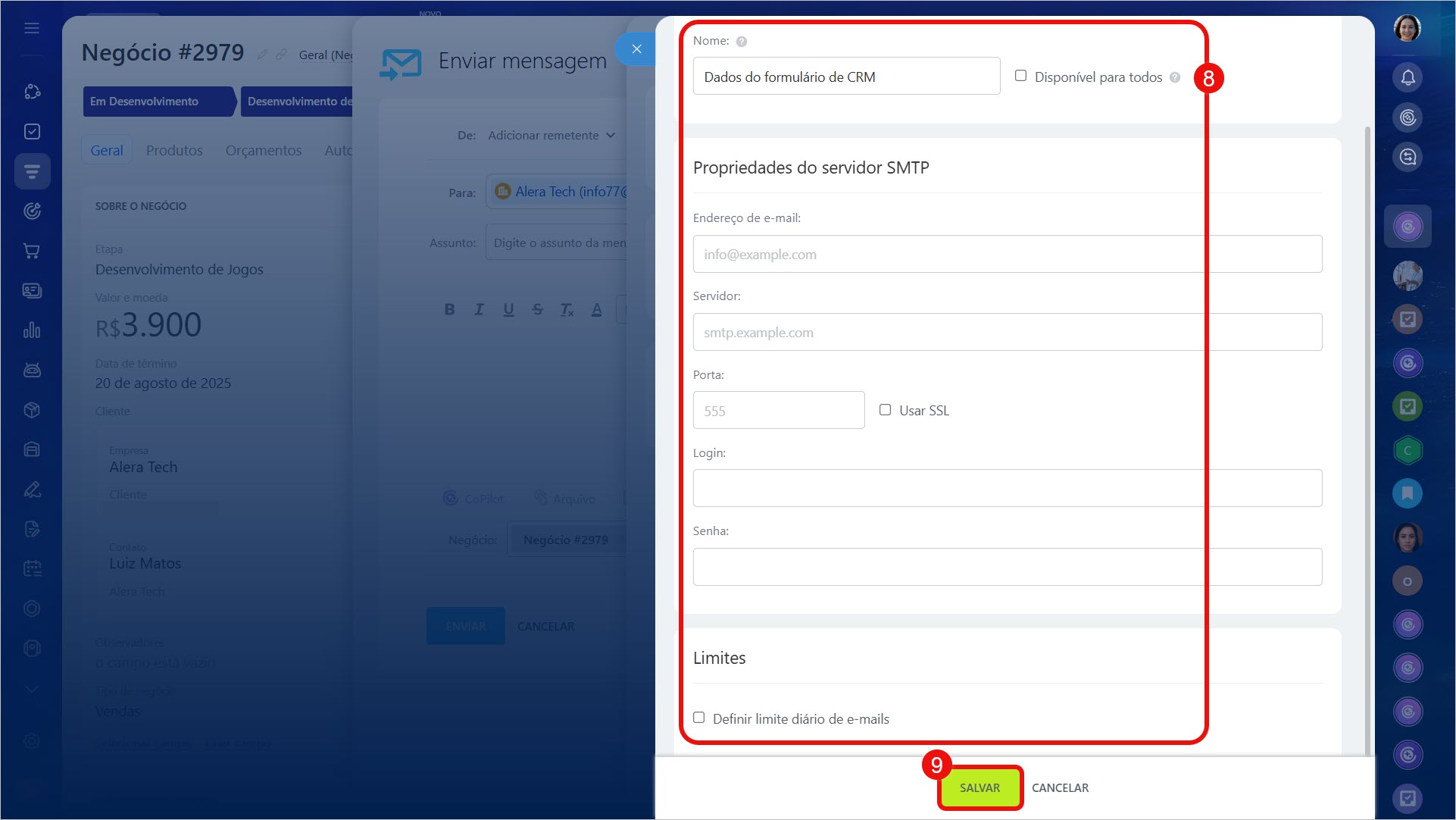 8–9. Preencha os dados do servidor SMTP e clique em Salvar.