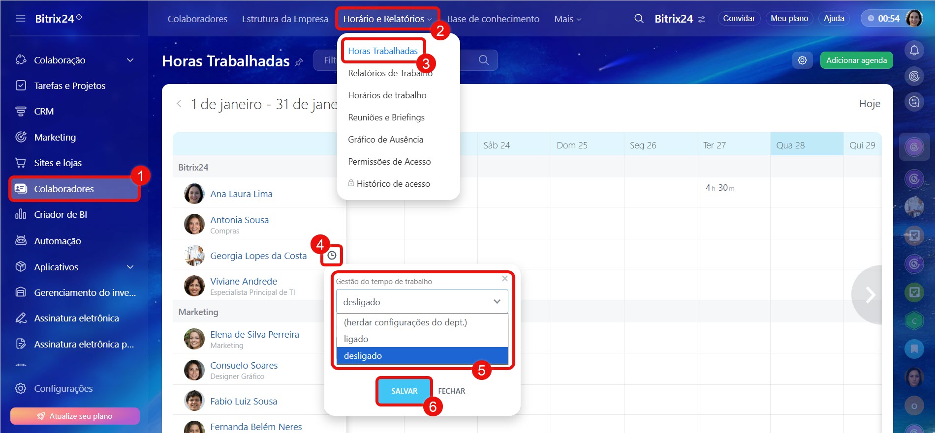 A seção Colaboradores no Bitrix24 ajuda a registrar o horário de trabalho, configurar escalas e visualizar relatórios de trabalho.