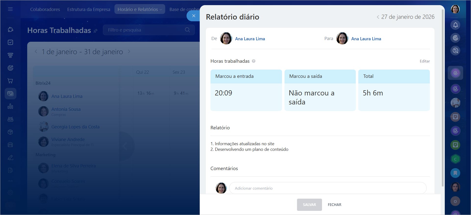 No Bitrix24 existem duas ferramentas para relatórios de trabalho do colaborador — "Feito no dia" na seção Horário de trabalho e o relatório regular na seção Relatórios de trabalho.