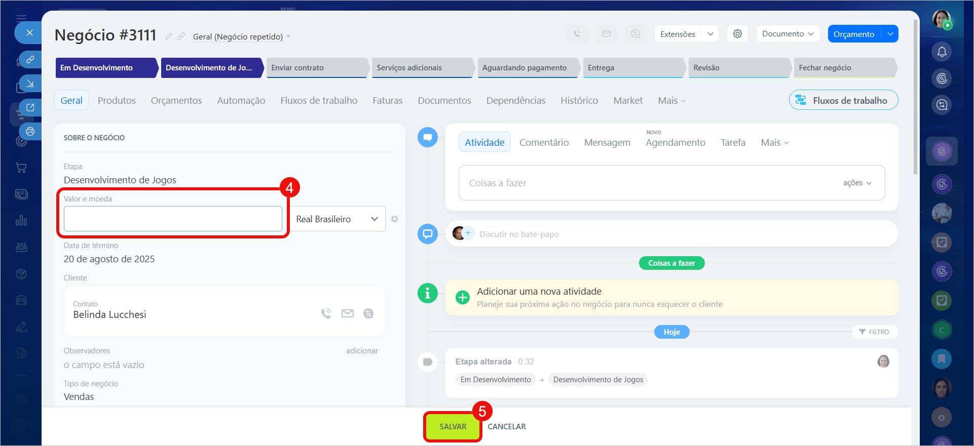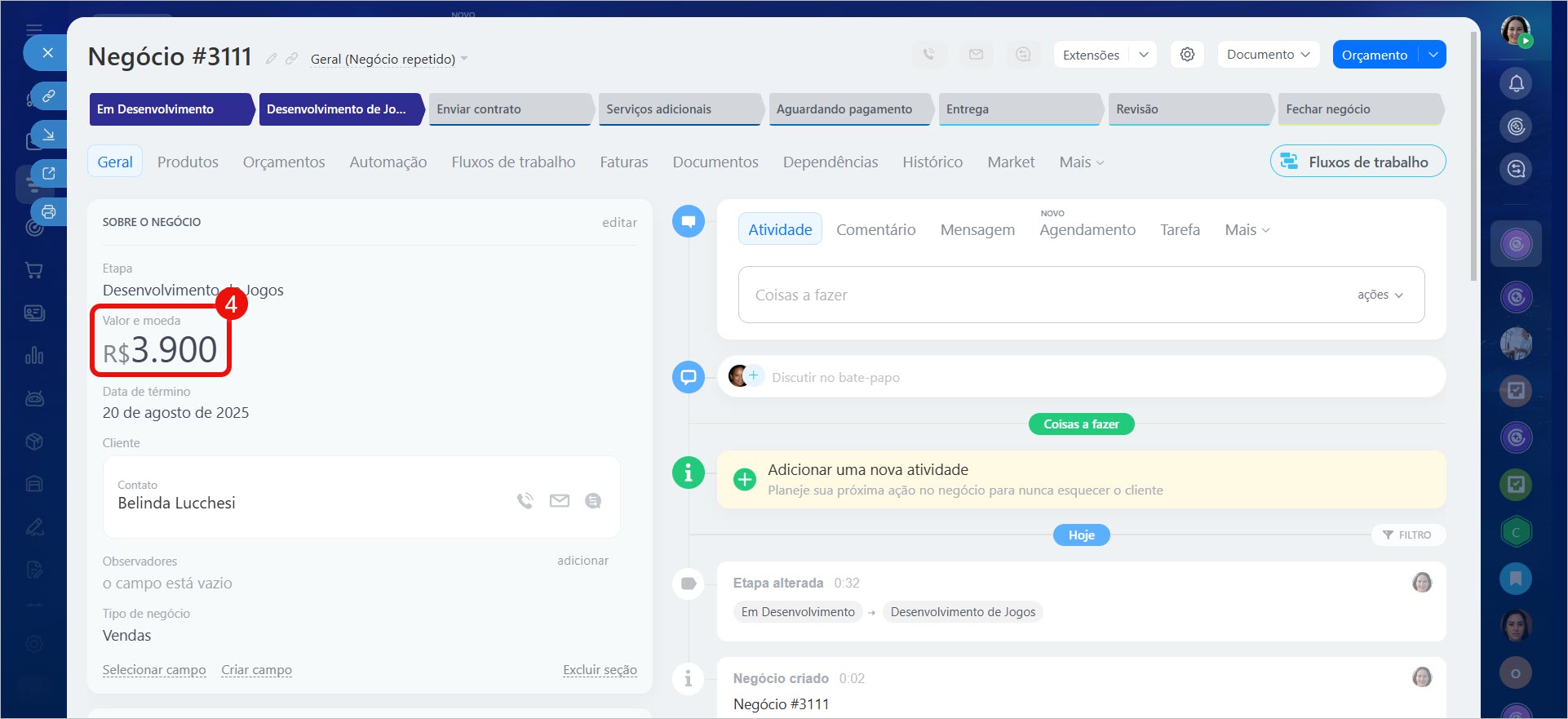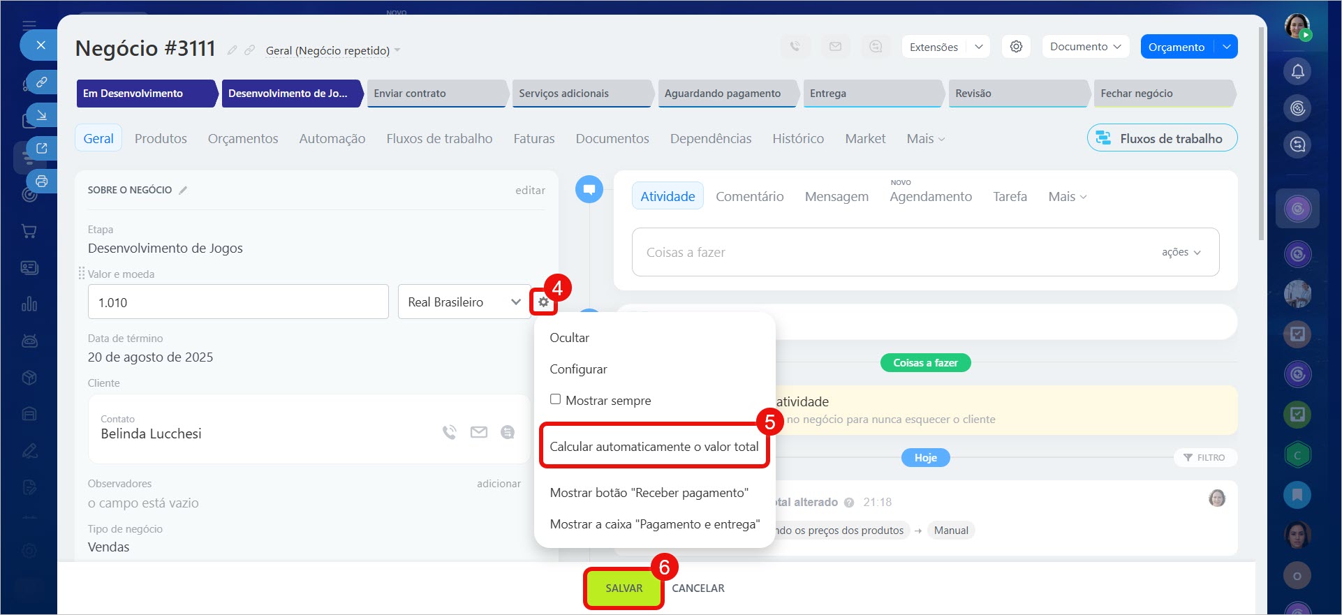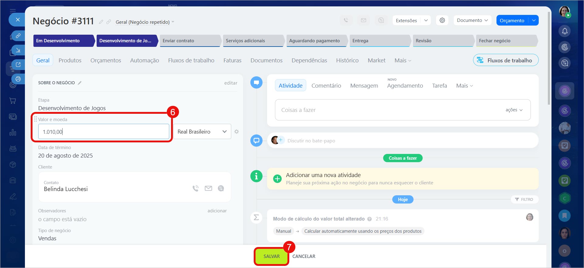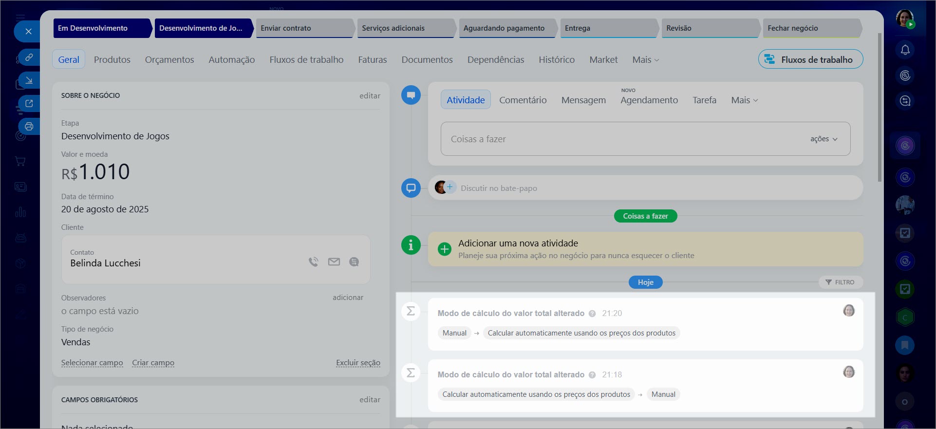 O CRM calculará automaticamente o valor com base nos produtos e serviços do negócio. A troca de modos é registrada na Linha do tempo do negócio e na aba Histórico.