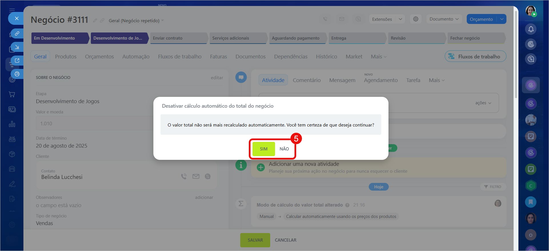 Se produtos já tiverem sido adicionados ao negócio, o CRM perguntará se você realmente deseja desativar o recálculo automático do valor.