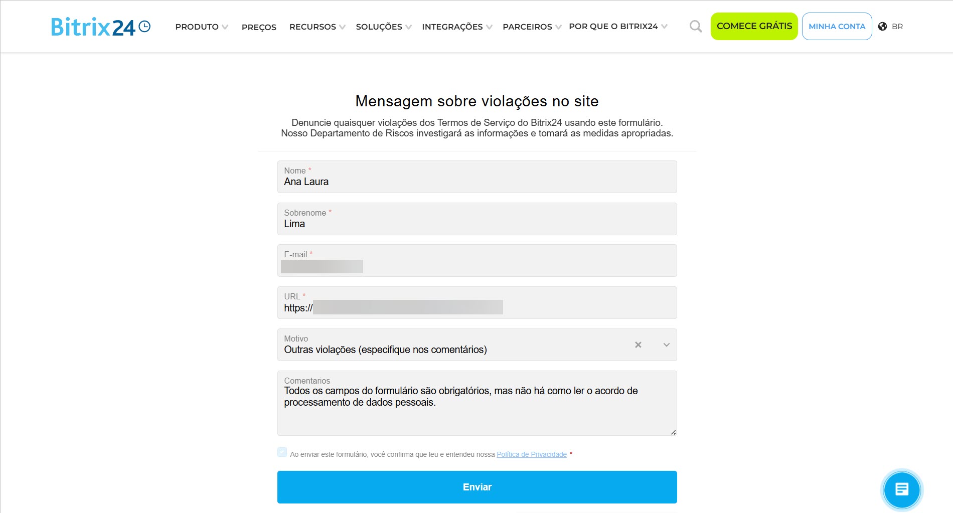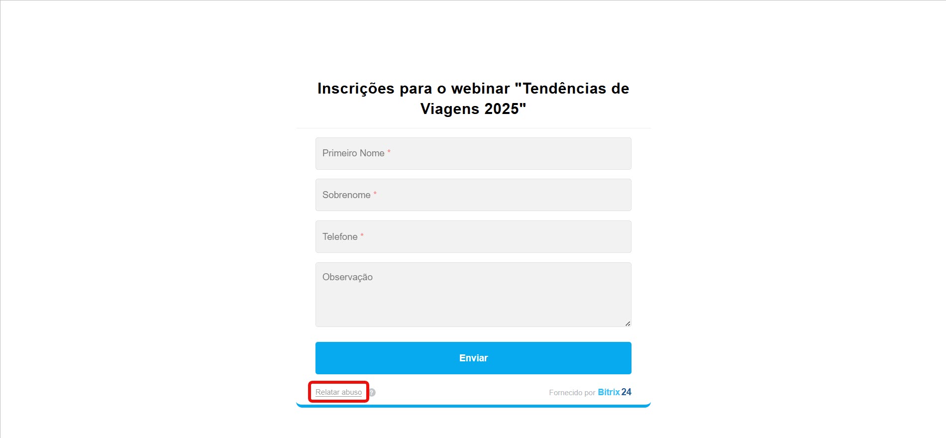 Para enviar uma denúncia, clique em Relatar abuso no Formulário de CRM, preencha o formulário de relato no site do Bitrix24 e envie-o.