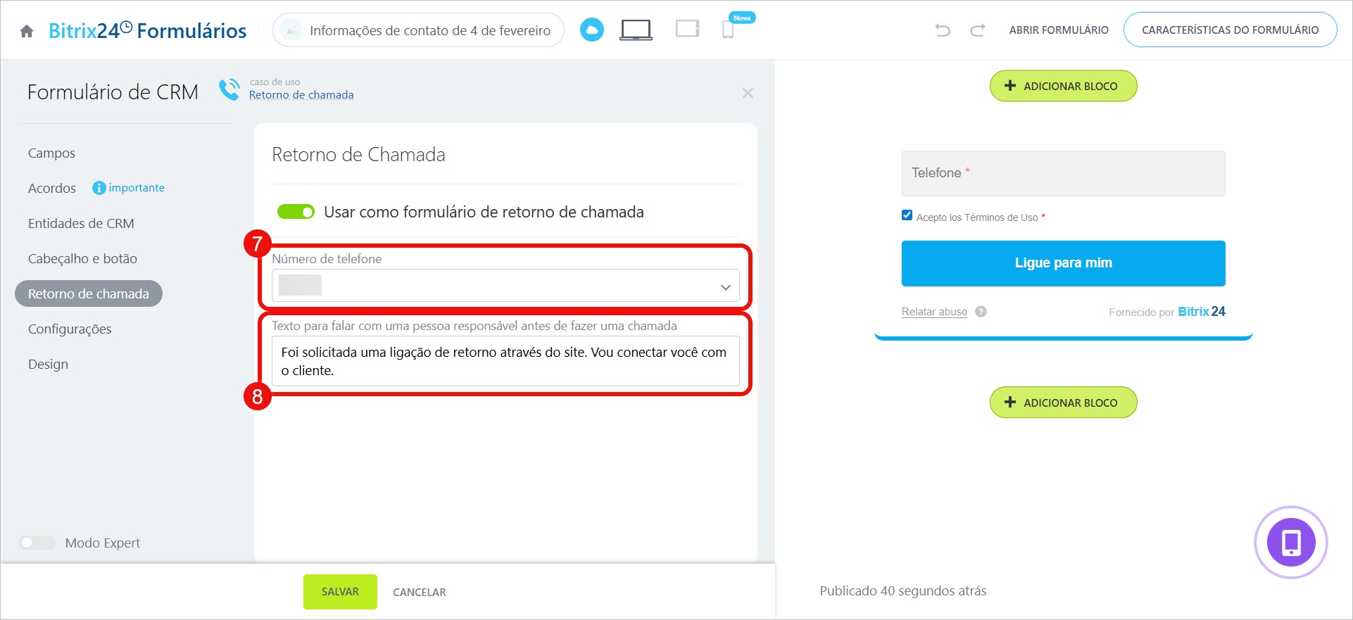 Como publicar o formulário de retorno de chamada