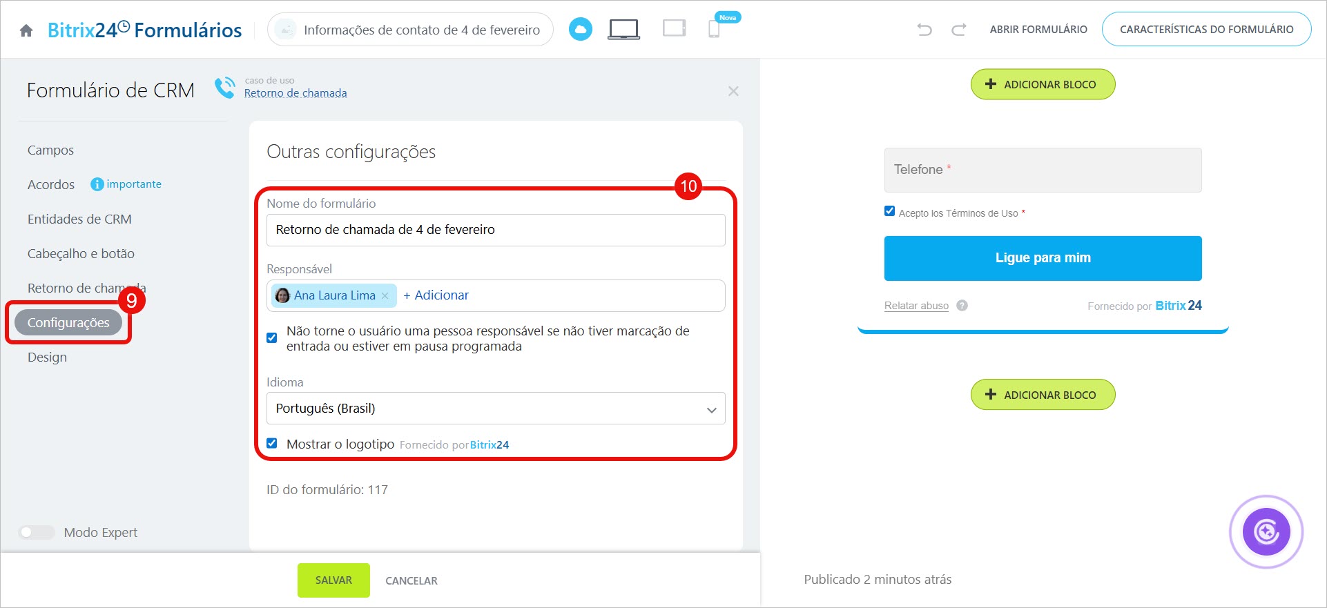 - atribua responsáveis — eles receberão os elementos do CRM criados após o preenchimento do formulário,