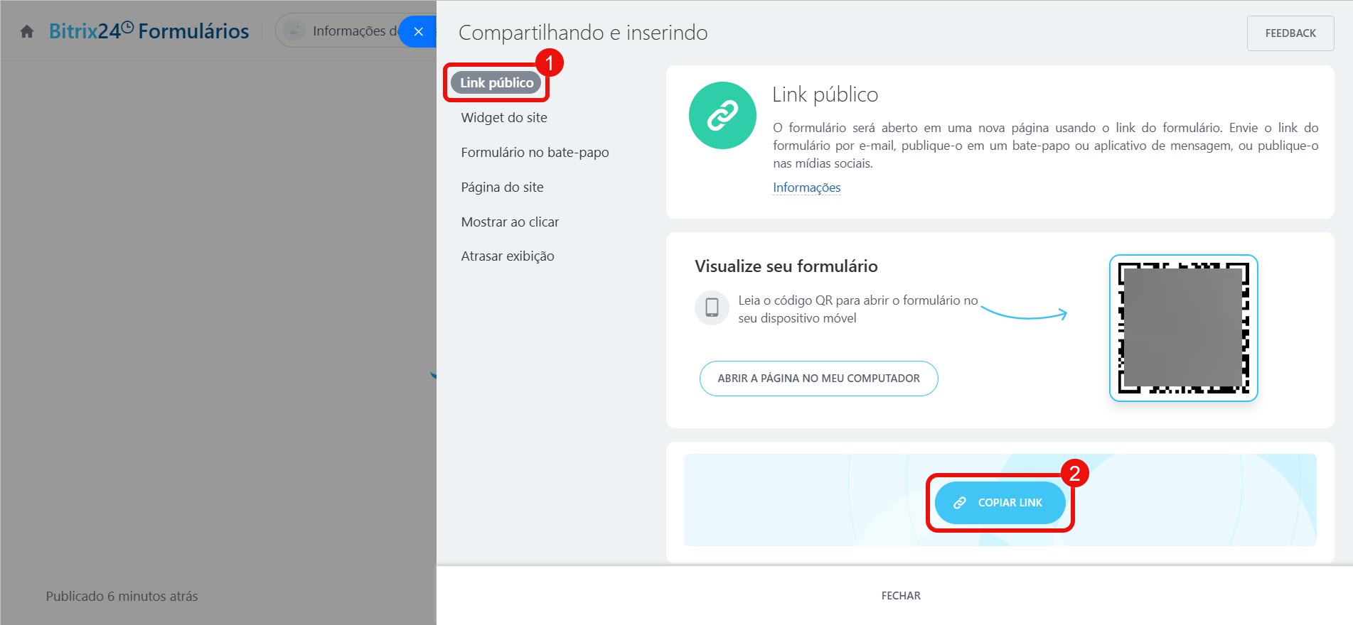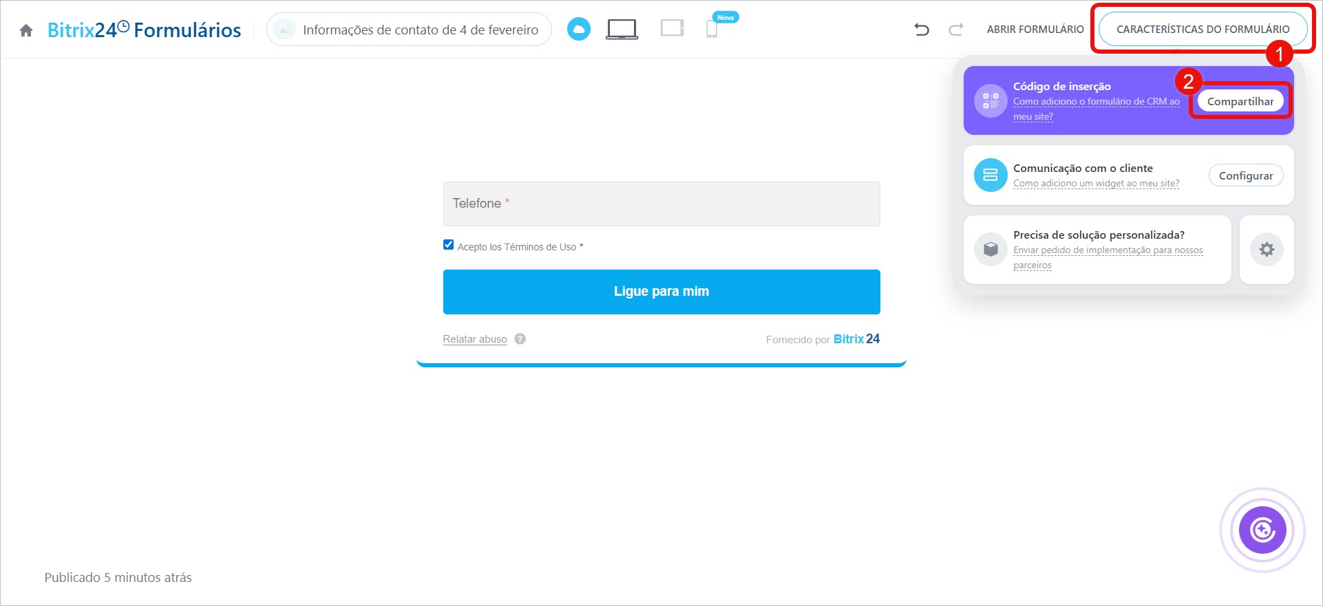 - O formulário de retorno de chamada pode ser colocado em uma página separada, em um site ou enviado em um bate-papo com o cliente. Clique em Recursos do formulário > Compartilhar e escolha a opção de publicação.