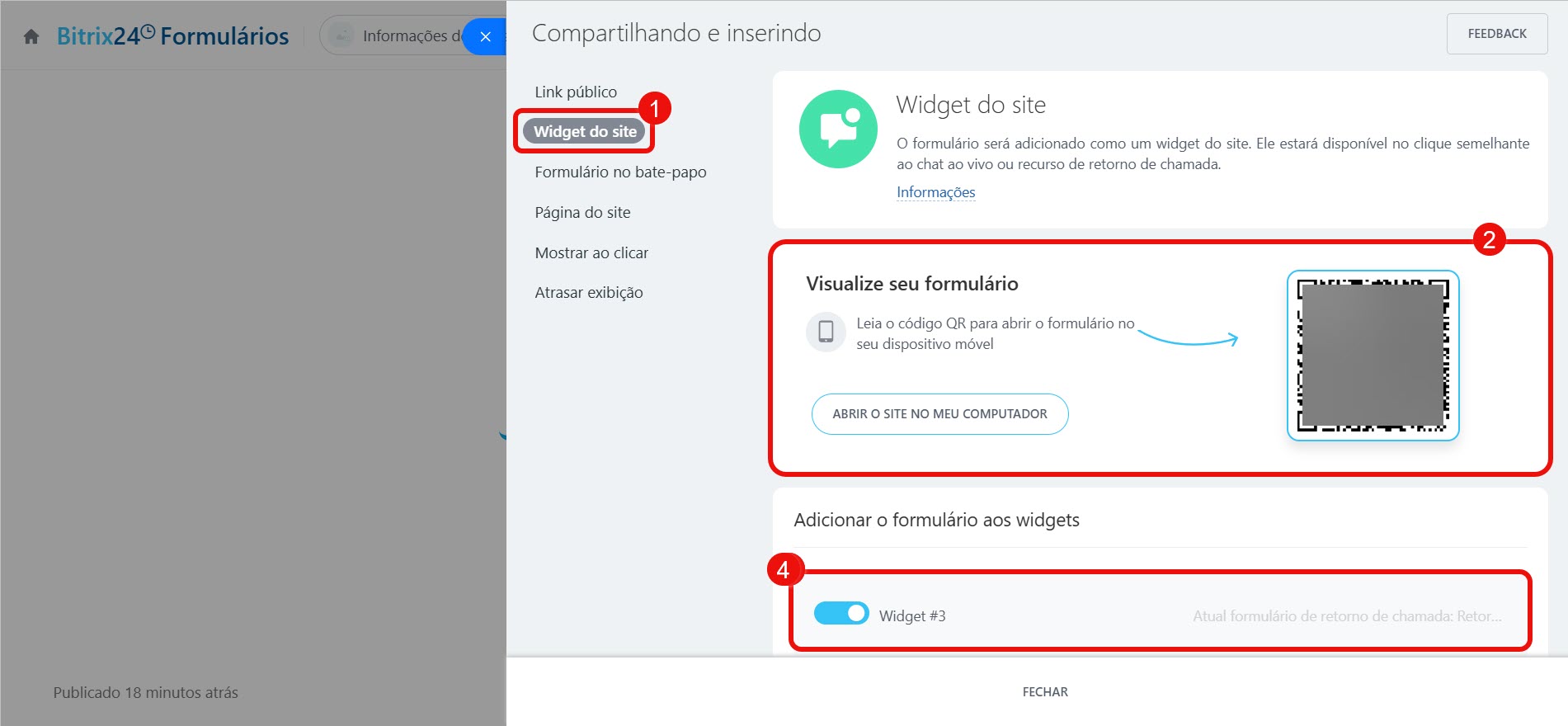 2. Veja como o formulário de retorno de chamada aparecerá na página. Para visualizar no computador, clique em Abrir página no computador; para ver no telefone — escaneie o QR code.