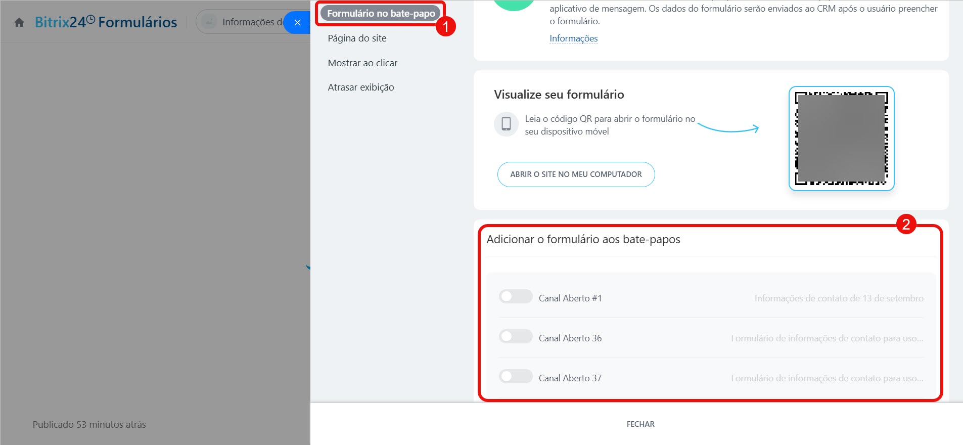 Clique em Bate-papo com o cliente e selecione o Canal Aberto onde deseja adicionar o formulário.