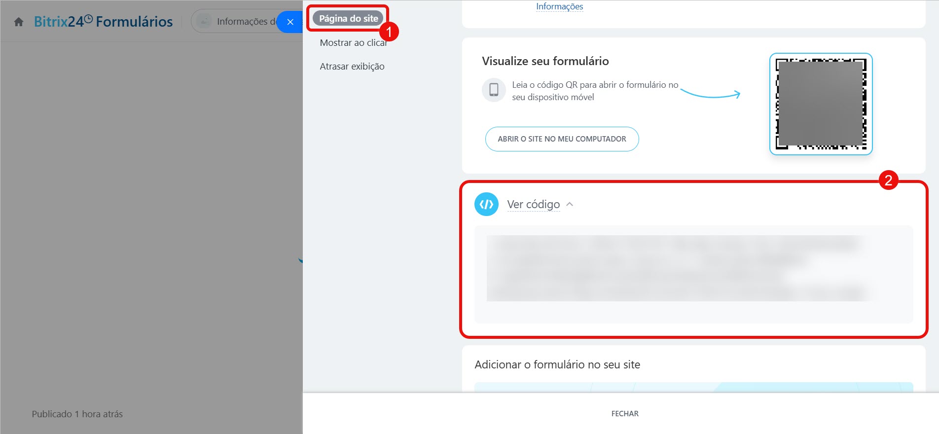 Na página do site. Para adicionar o formulário a um site não criado no Bitrix24, use o código pronto. Ele pode ser incorporado em qualquer lugar do seu site.