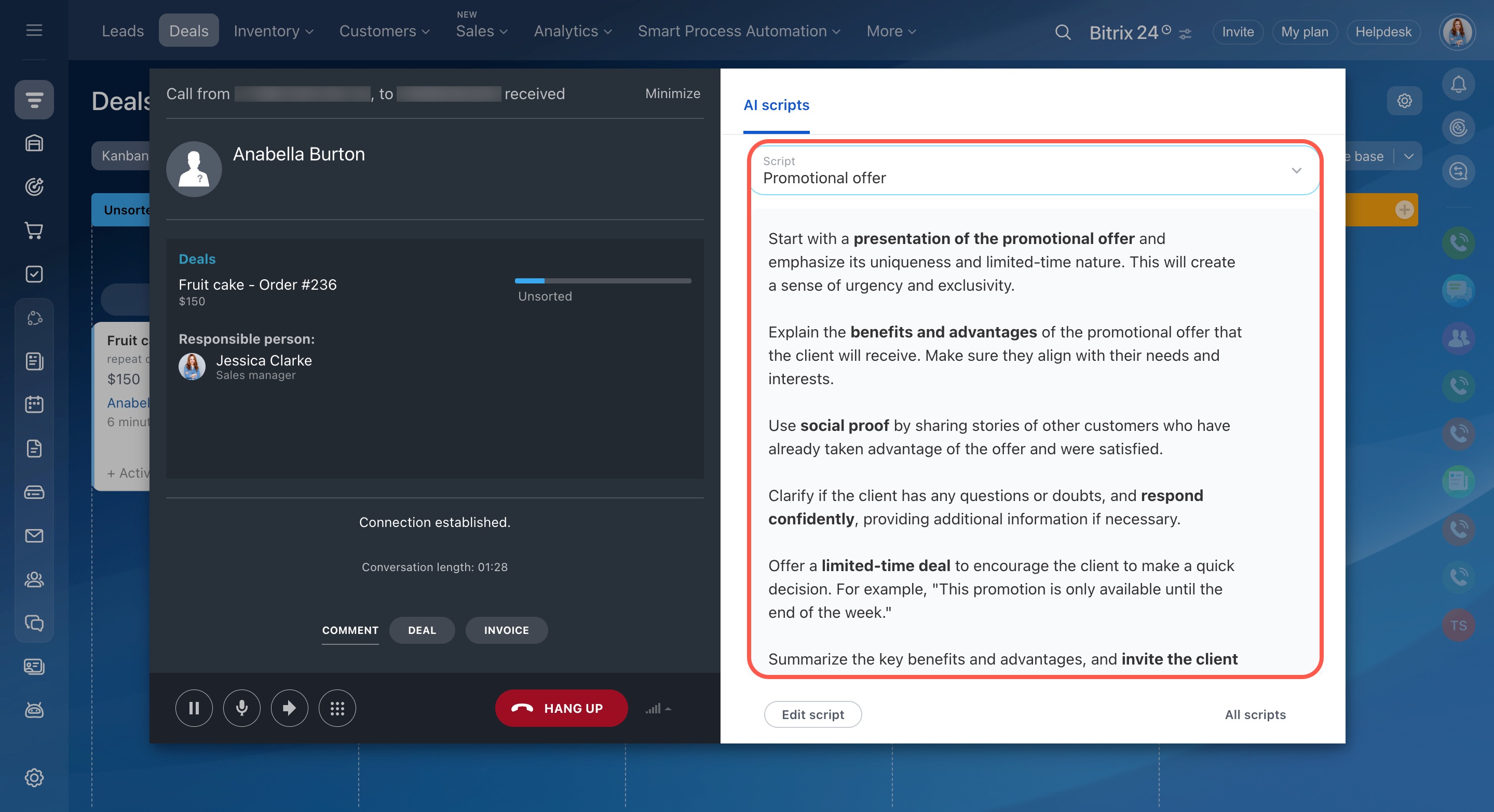 Na janela da chamada, um script adequado para esse tipo de cliente é aberto automaticamente. Por exemplo, se o cliente ainda não estiver no CRM, o atendente terá o script para o primeiro contato — ele ajudará a se orientar mais rapidamente e processar a chamada.