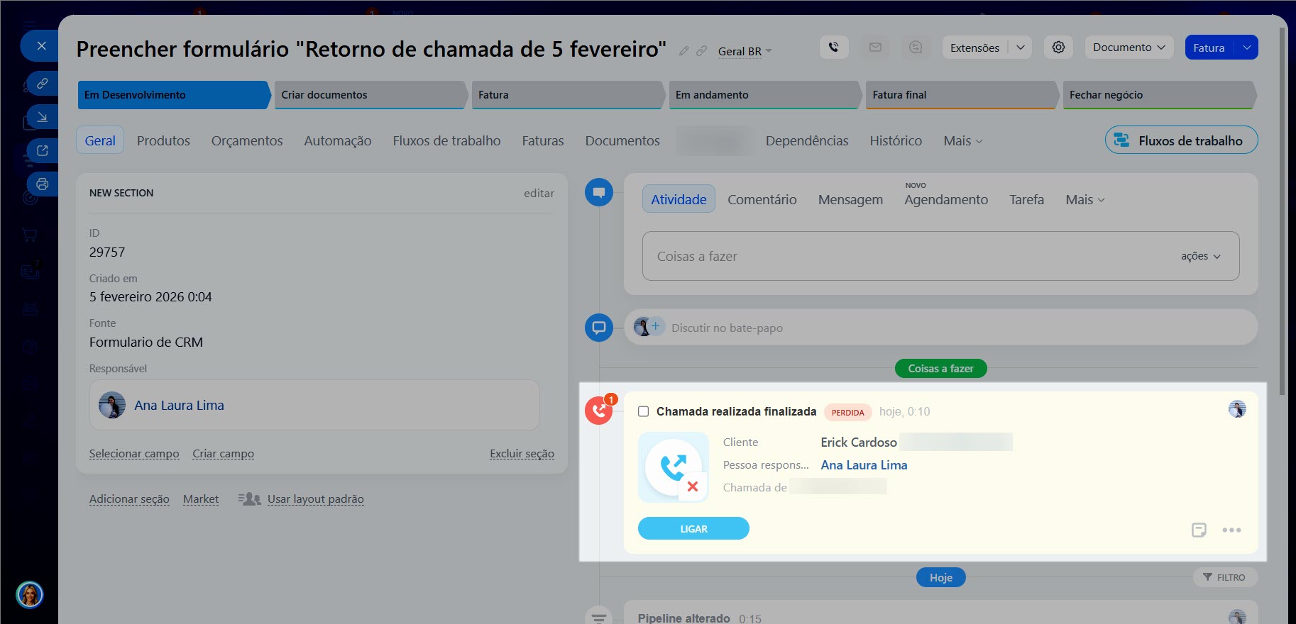 O atendente não pode receber chamadas de entrada. Um elemento com os dados do cliente aparece no CRM. Uma atividade sobre chamada perdida é criada automaticamente na Linha do tempo. O atendente vê o novo elemento e retorna a chamada do cliente a partir do cartão, pelo botão Ligar.