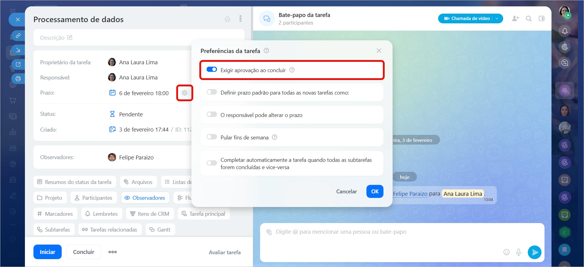 Se você precisar controlar o resultado da tarefa, ative a opção Exigir aprovação ao concluir nas configurações da tarefa. Assim que o usuário responsável marcar a tarefa como concluída, ela será enviada para você revisar. Você pode aceitar a tarefa ou devolvê-la para conclusão.