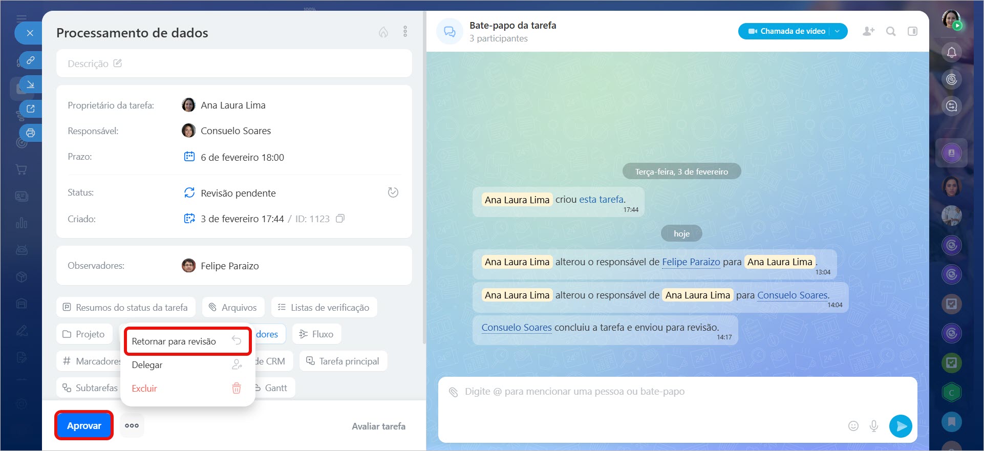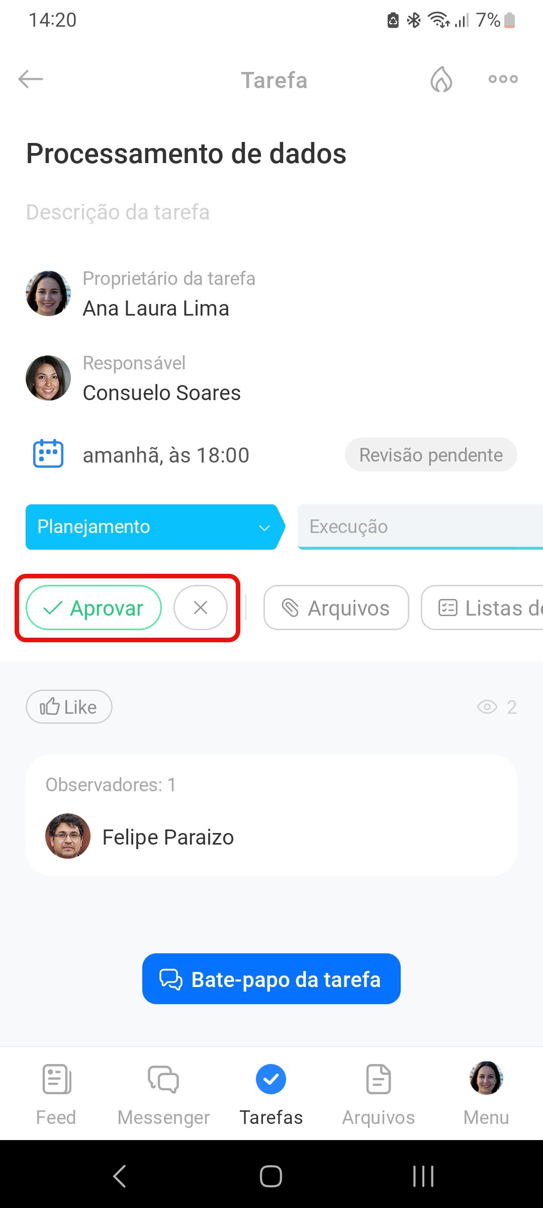 Assim que o responsável concluir a tarefa, você receberá uma notificação informando que ela precisa ser revisada. Se estiver satisfeito com o resultado, clique em Aprovar. Caso a tarefa precise de mais ajustes, clique no ícone X. A tarefa será devolvida ao responsável.