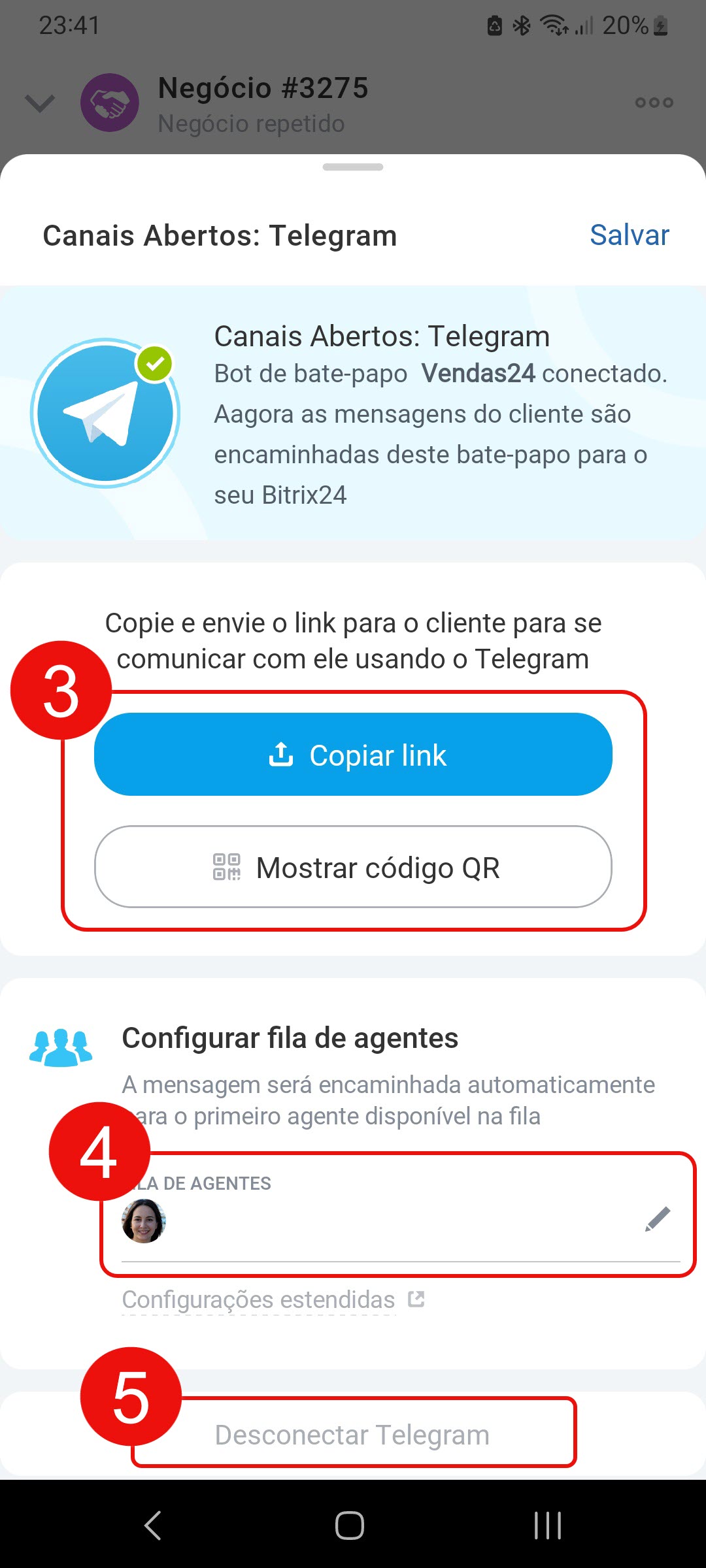 5. Se o bot do Telegram não for mais necessário ou você quiser conectar outro, clique em Desconectar Telegram.