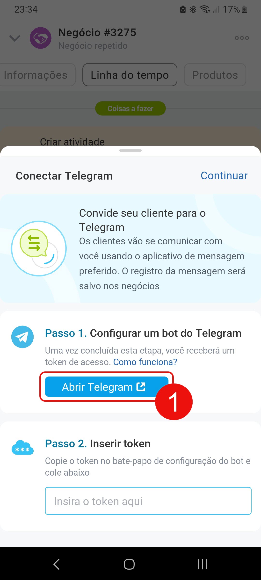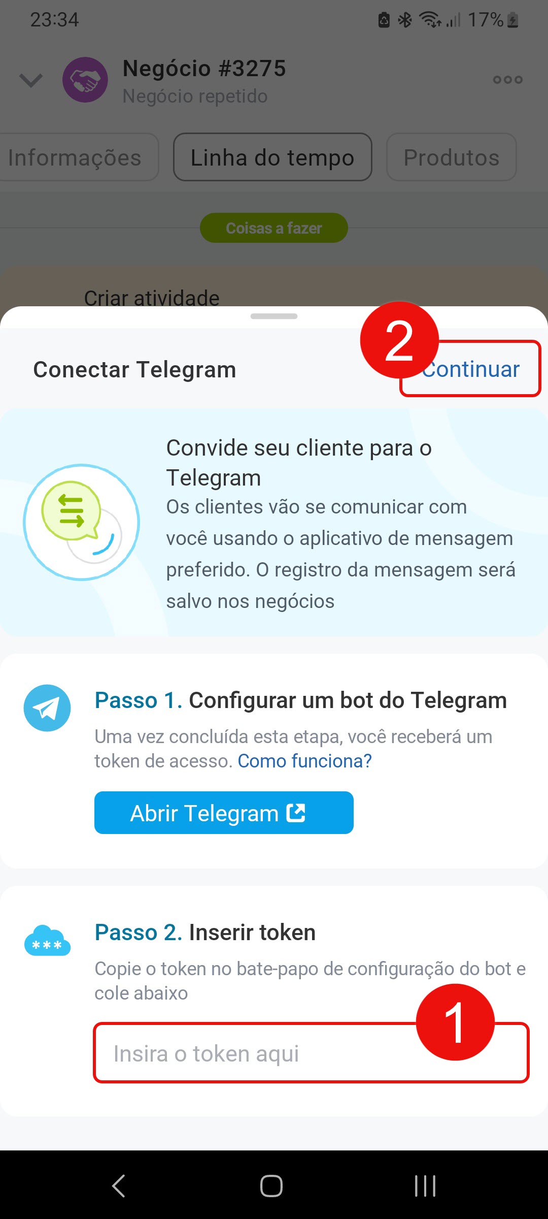 1–2. Cole o token no campo Passo 2 e clique em Continuar. O Telegram será conectado ao último Canal Aberto criado. Para escolher outro, acesse o Bitrix24 pelo computador.