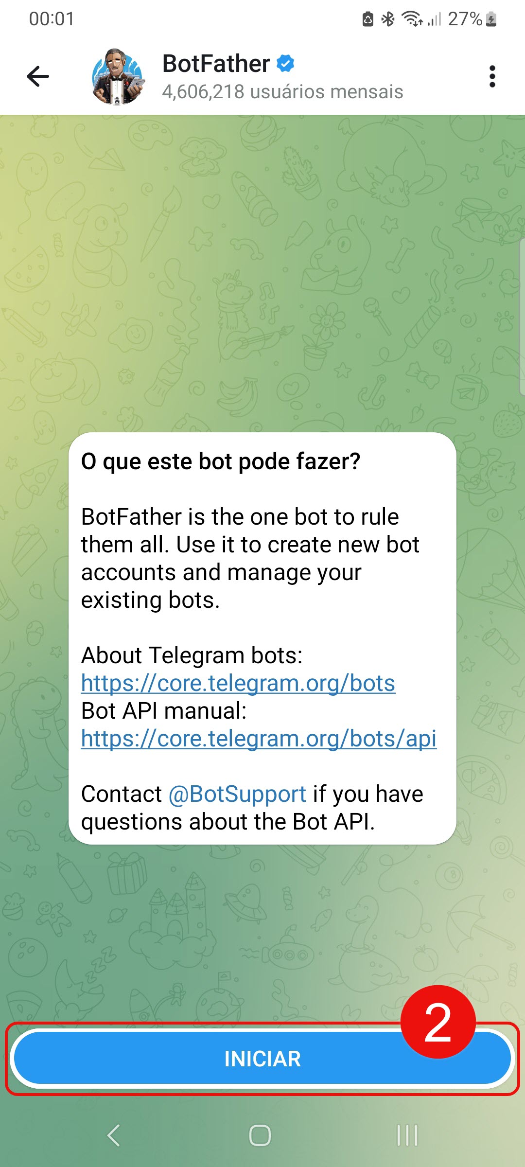 2. O aplicativo do Telegram será aberto, assim como um bate-papo com o bot @BotFather, que cria bots e fornece tokens. Clique em Iniciar.