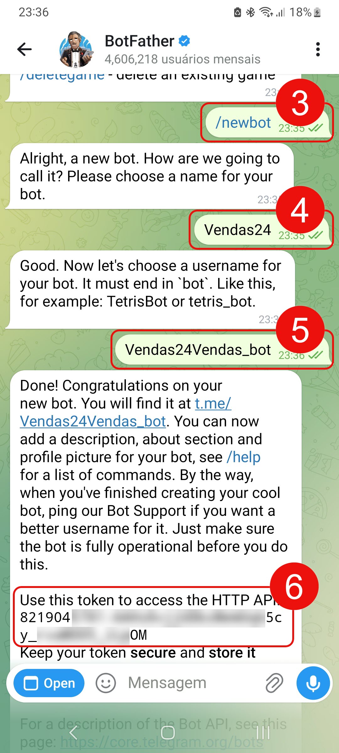 Se você ainda não tem um bot no Telegram, crie um novo. Se o bot já existir, copie o token.