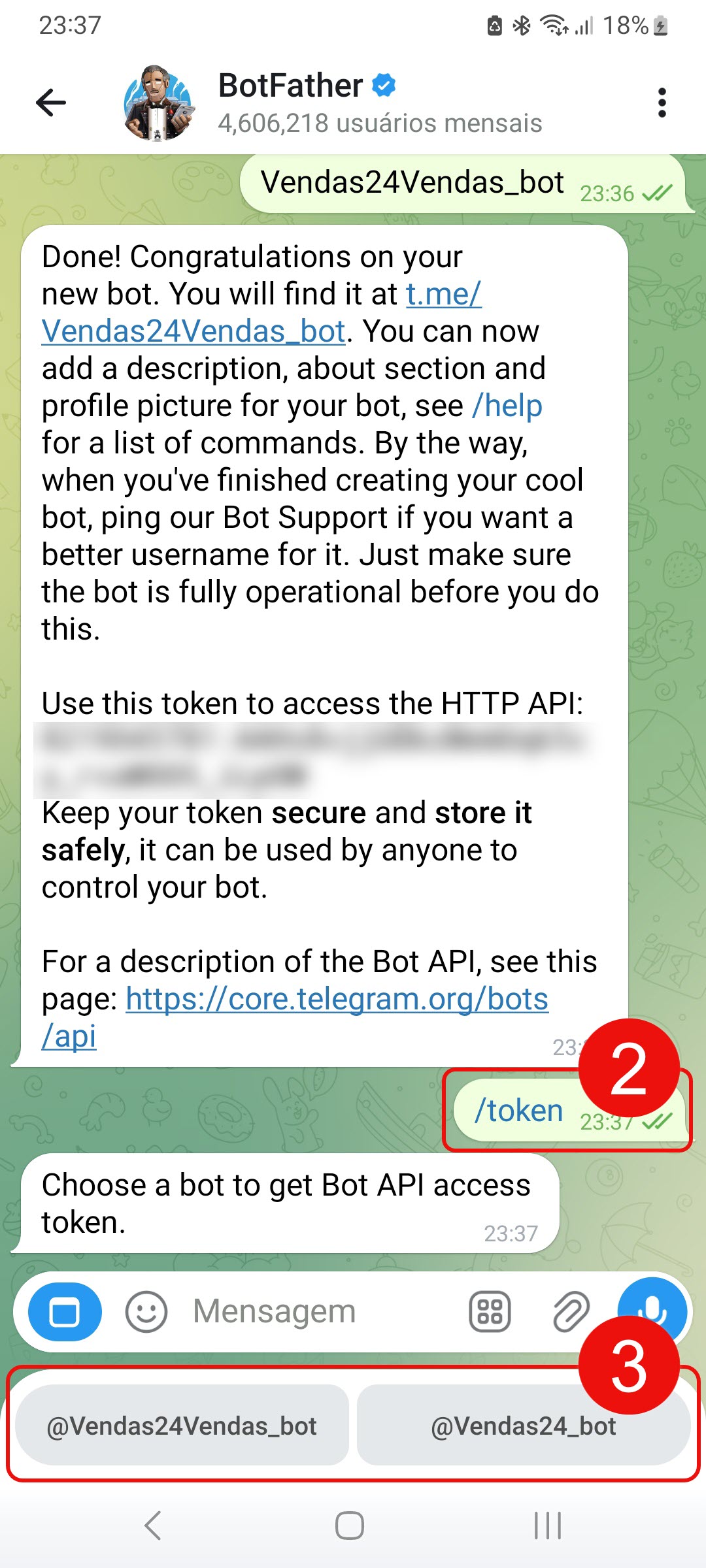 6. Pronto, o bot foi criado. Para copiar o token, clique na linha que aparece imediatamente após a frase Use this token to access the HTTP API.