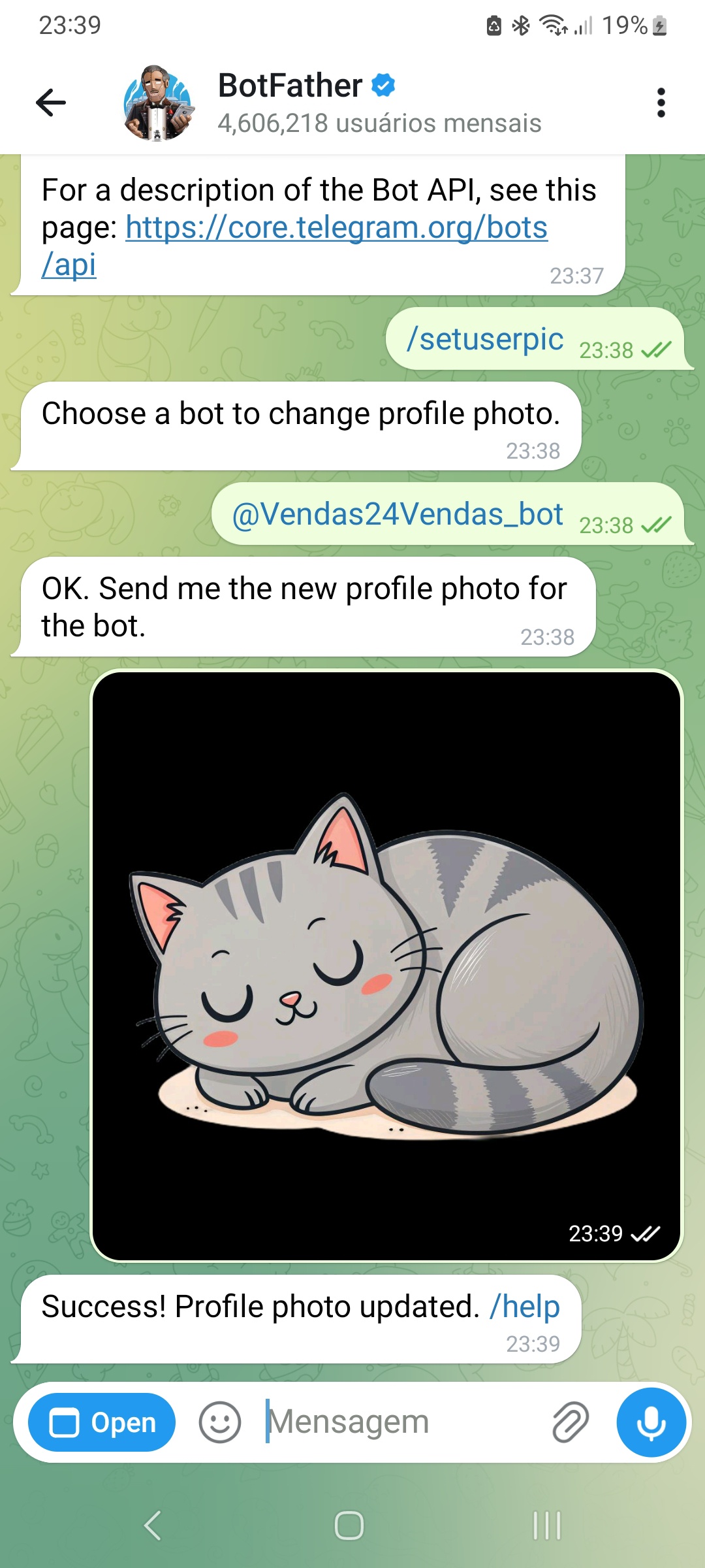 Definir um avatar para o bot. Digite o comando /setuserpic, informe o nome de usuário do seu bot e envie a imagem no bate-papo.