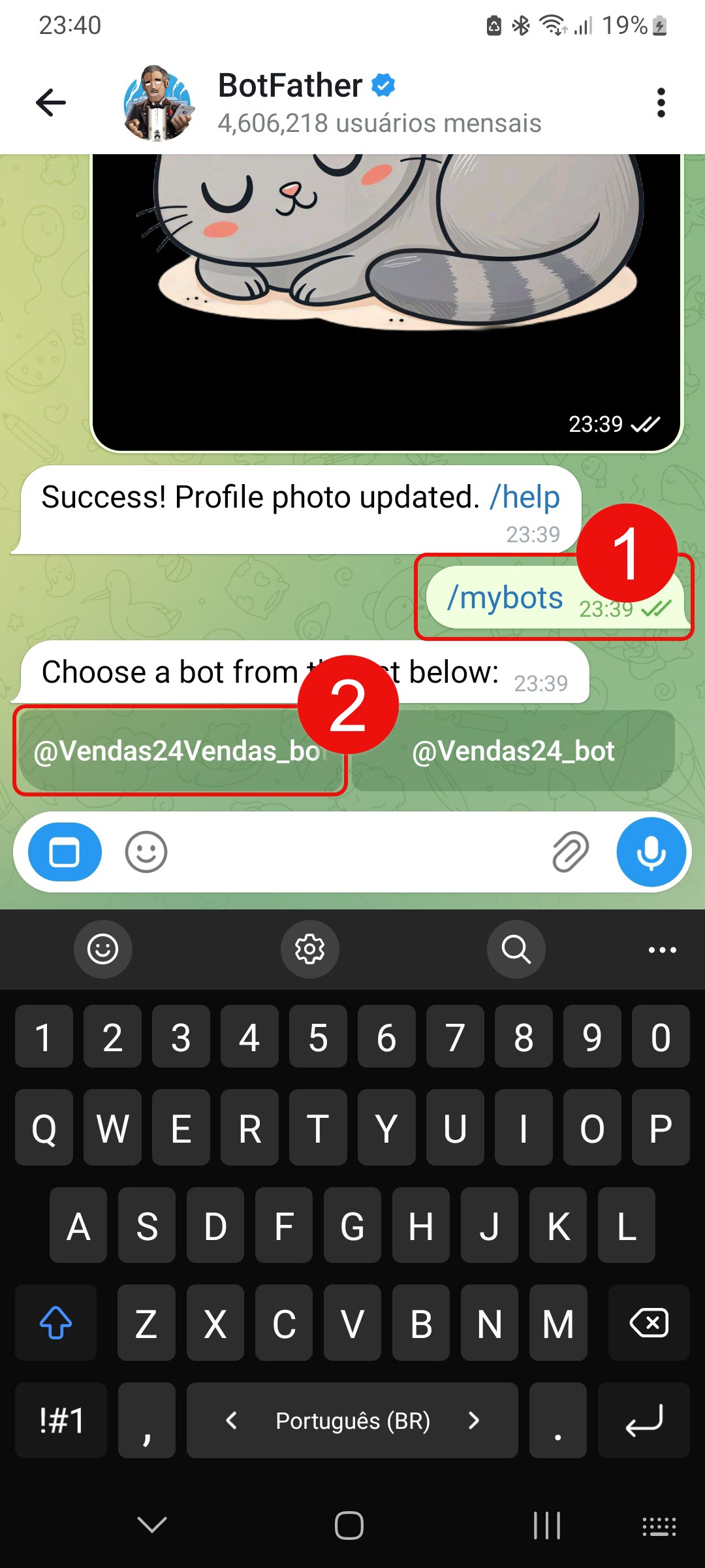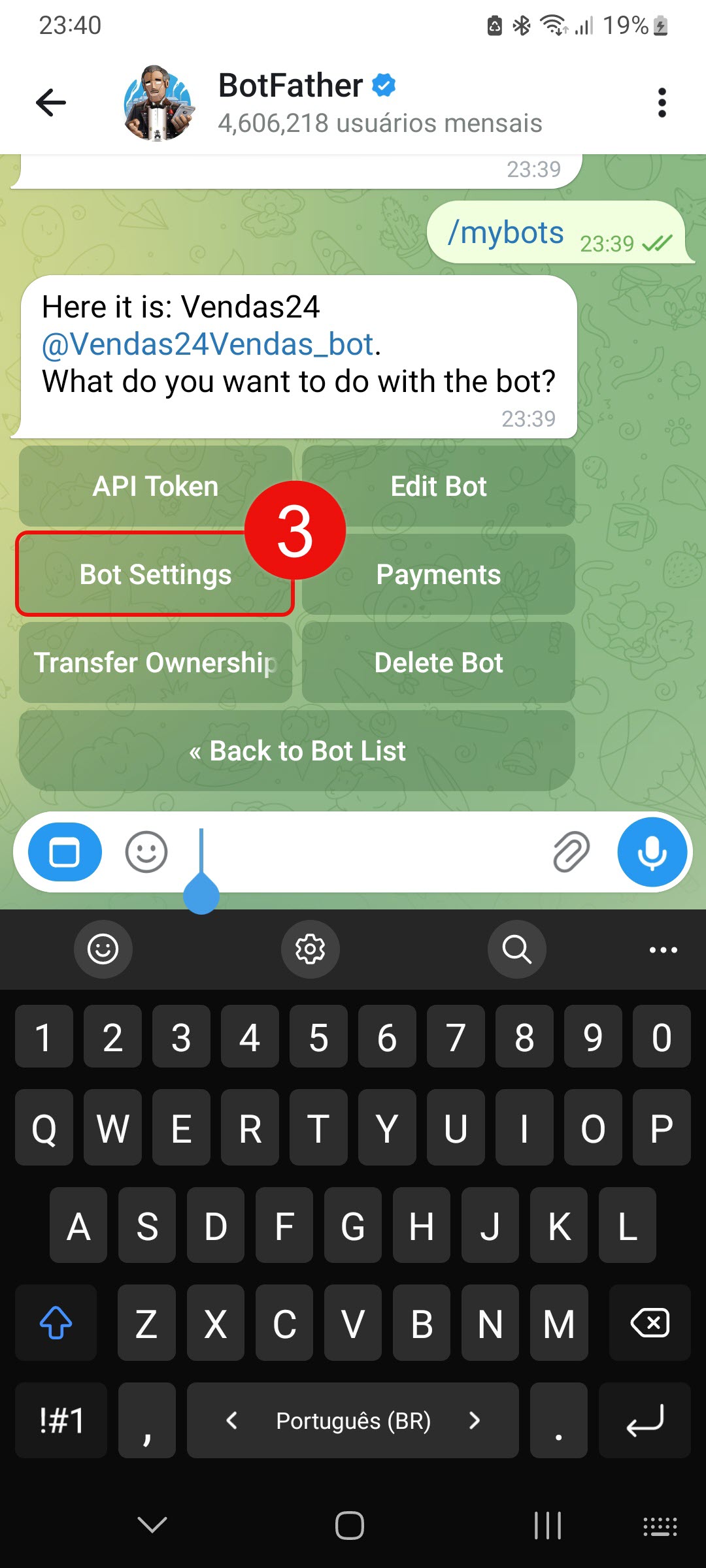 1–2. Digite o comando /mybots, e selecione seu bot.