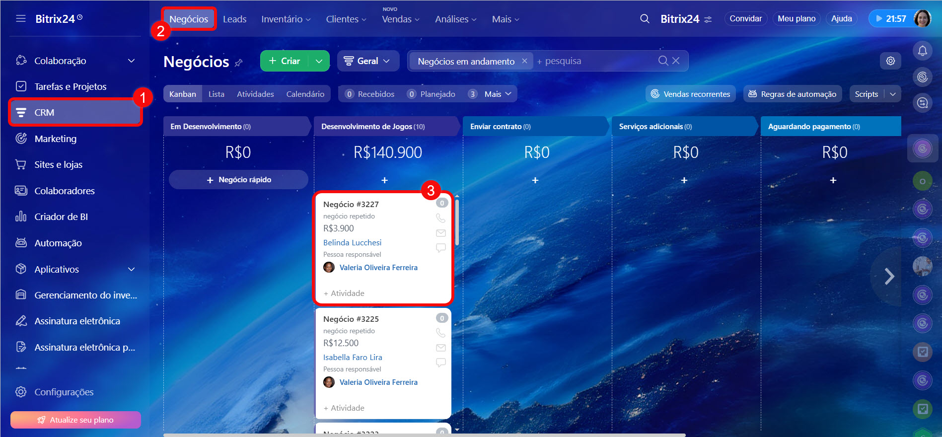 1–3. Vá para a seção CRM > Negócios e abra o desejado.