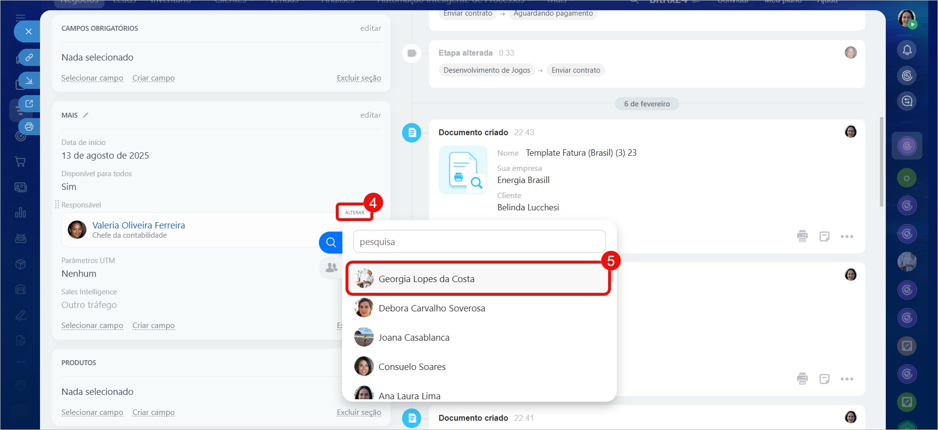 - Alterar o responsável no CRM permite transferir o trabalho com um cliente para outro colaborador durante férias, desligamento ou redistribuição de carga.