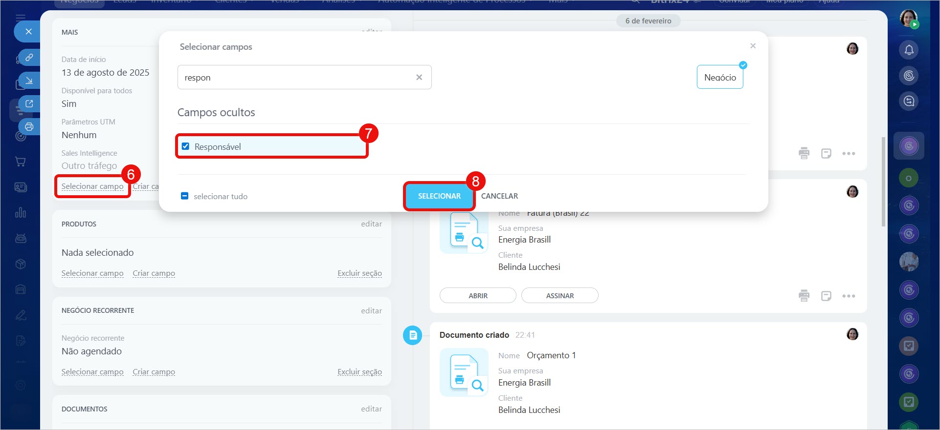 6–8. Se o campo não estiver visível, significa que está oculto. Para restaurá-lo, clique em Selecionar campo, marque Responsável na seção Campos ocultos e clique em Selecionar.
