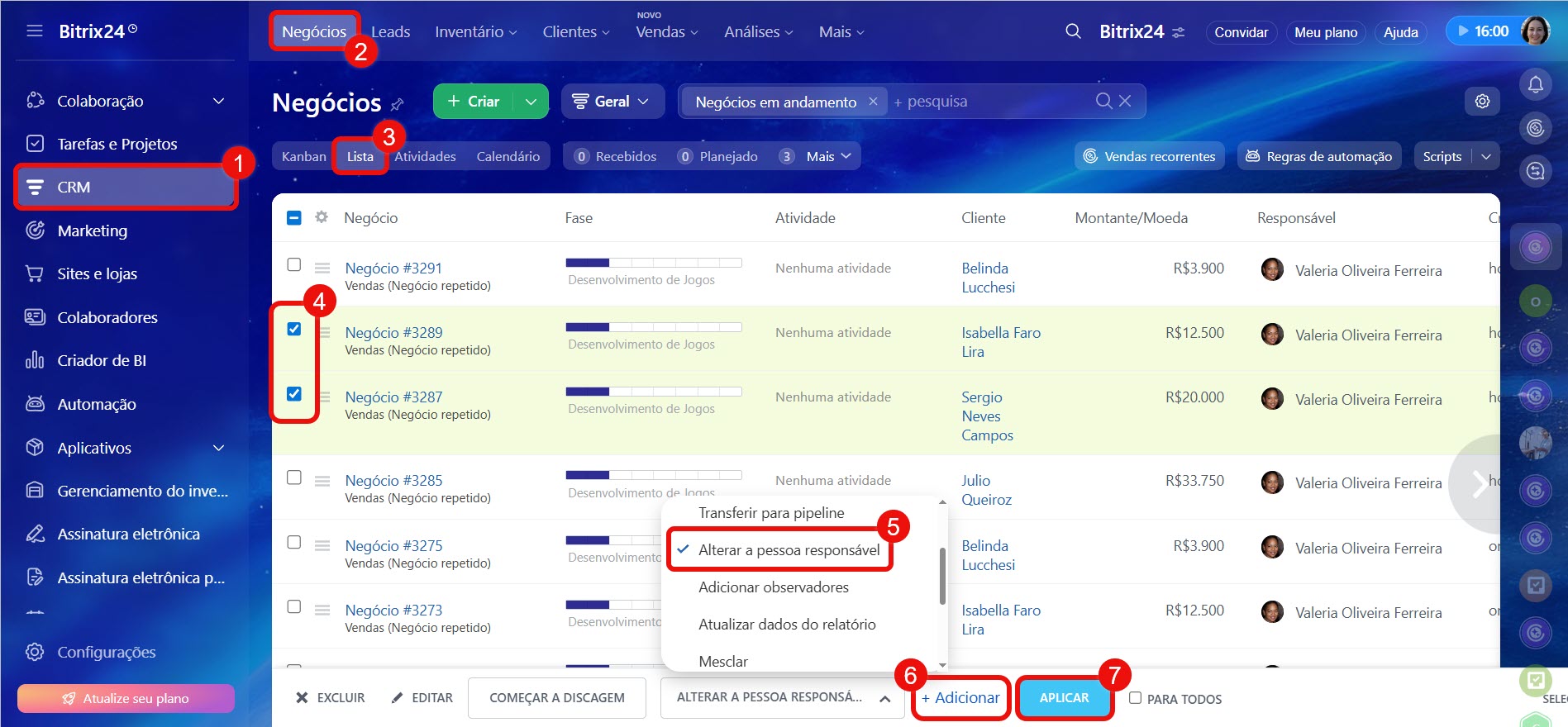 5–7. Na lista de ações, selecione Alterar a pessoa responsável > Adicionar. Especifique o colaborador e clique em Aplicar. O responsável será alterado em todos os negócios selecionados.