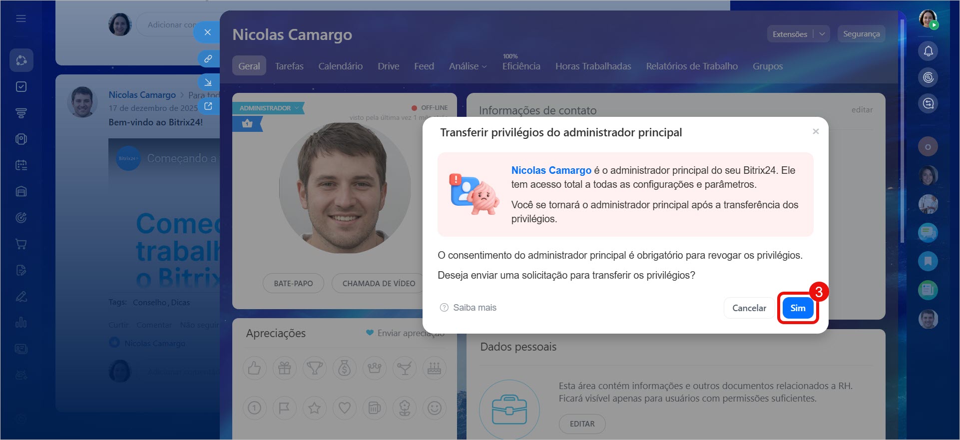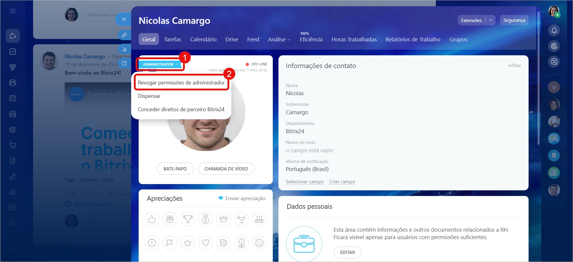 Se esse colaborador sair da empresa ou não for mais o responsável pela administração do Bitrix24, as permissões dele precisam ser transferidas para outro usuário. Isso só pode ser feito por outro colaborador com permissões de administrador.