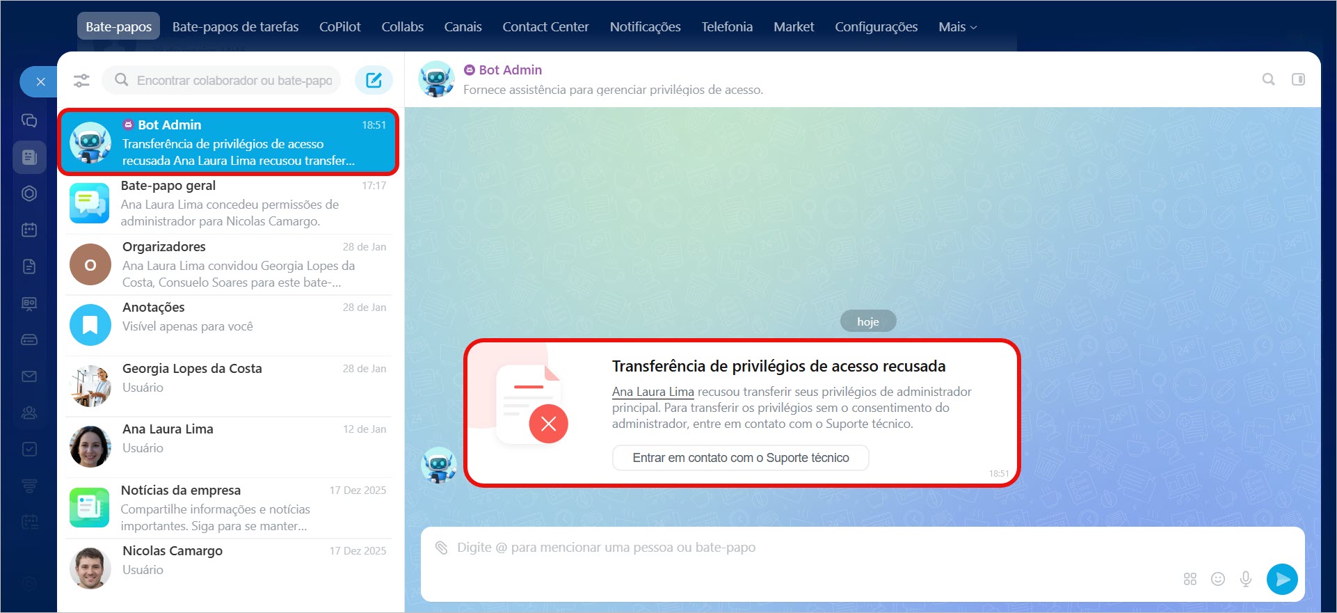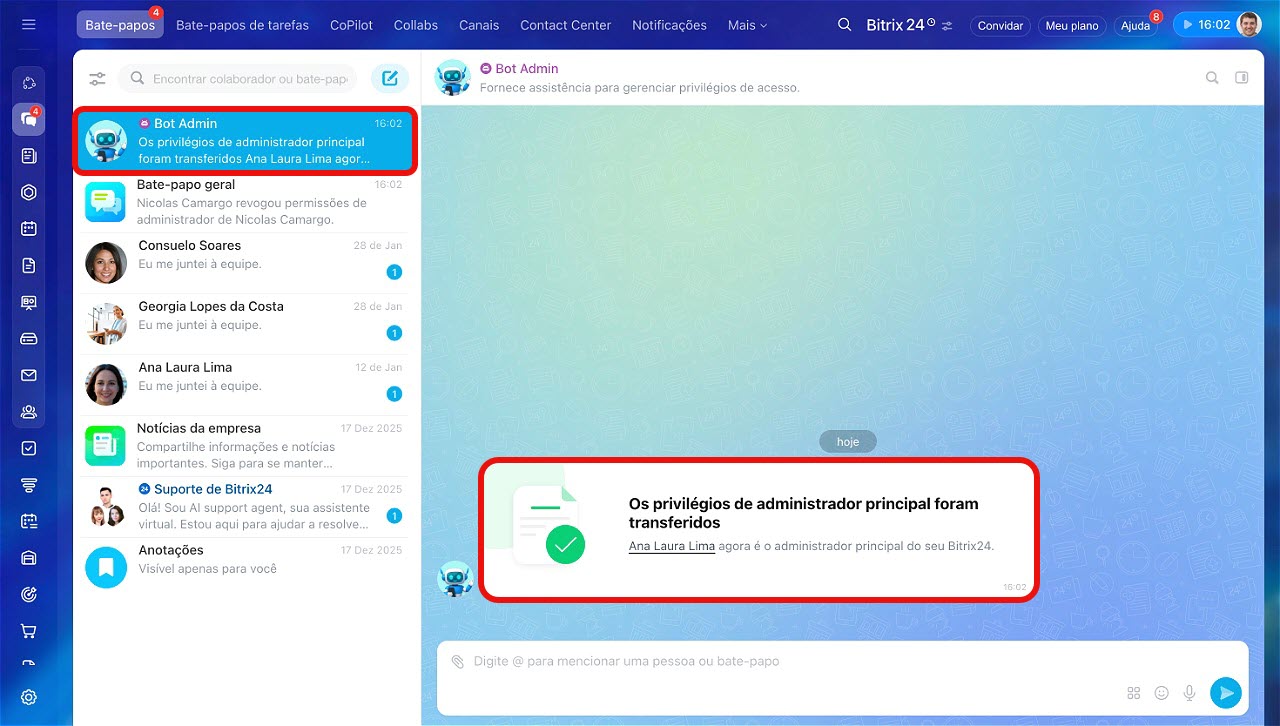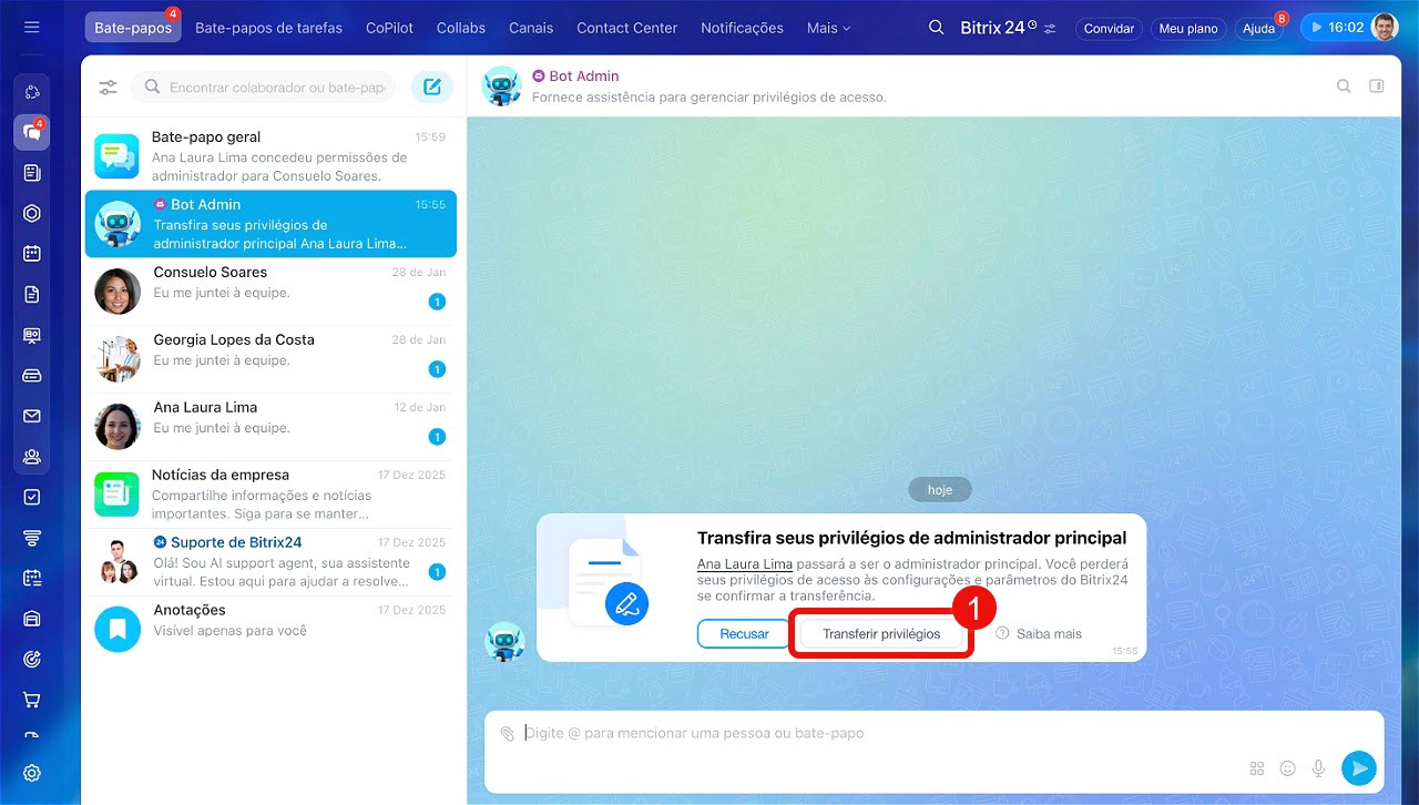 O administrador principal receberá uma mensagem do Bot Admin solicitando a transferência de permissões, com informações sobre o colaborador que enviou o pedido.
