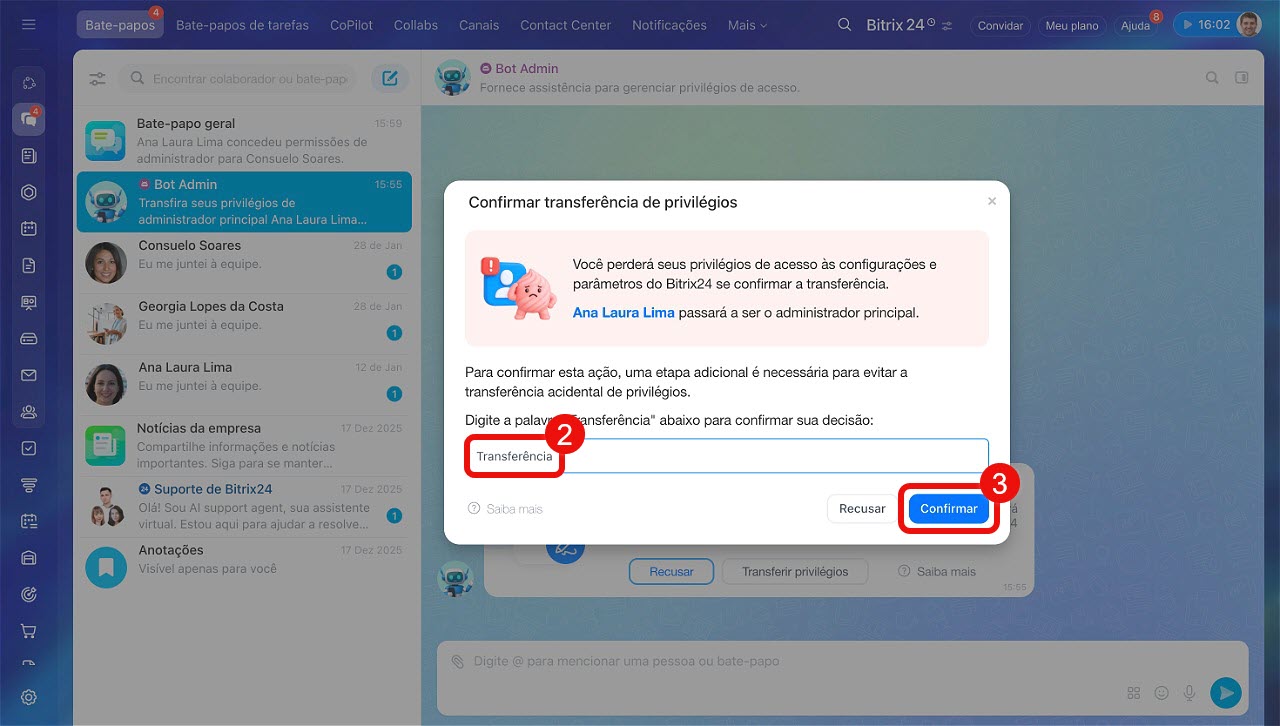 - Clique em Confirmar. Após isso, as permissões de administrador principal serão transferidas para o outro colaborador.