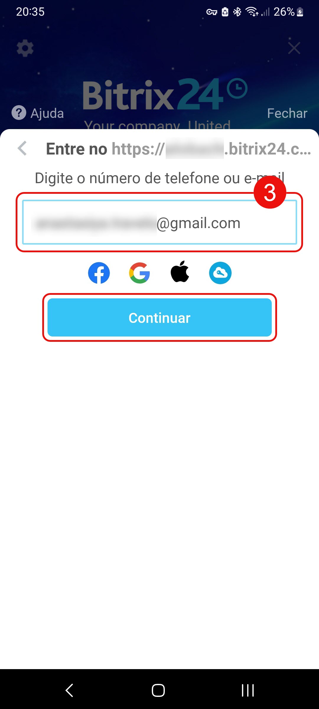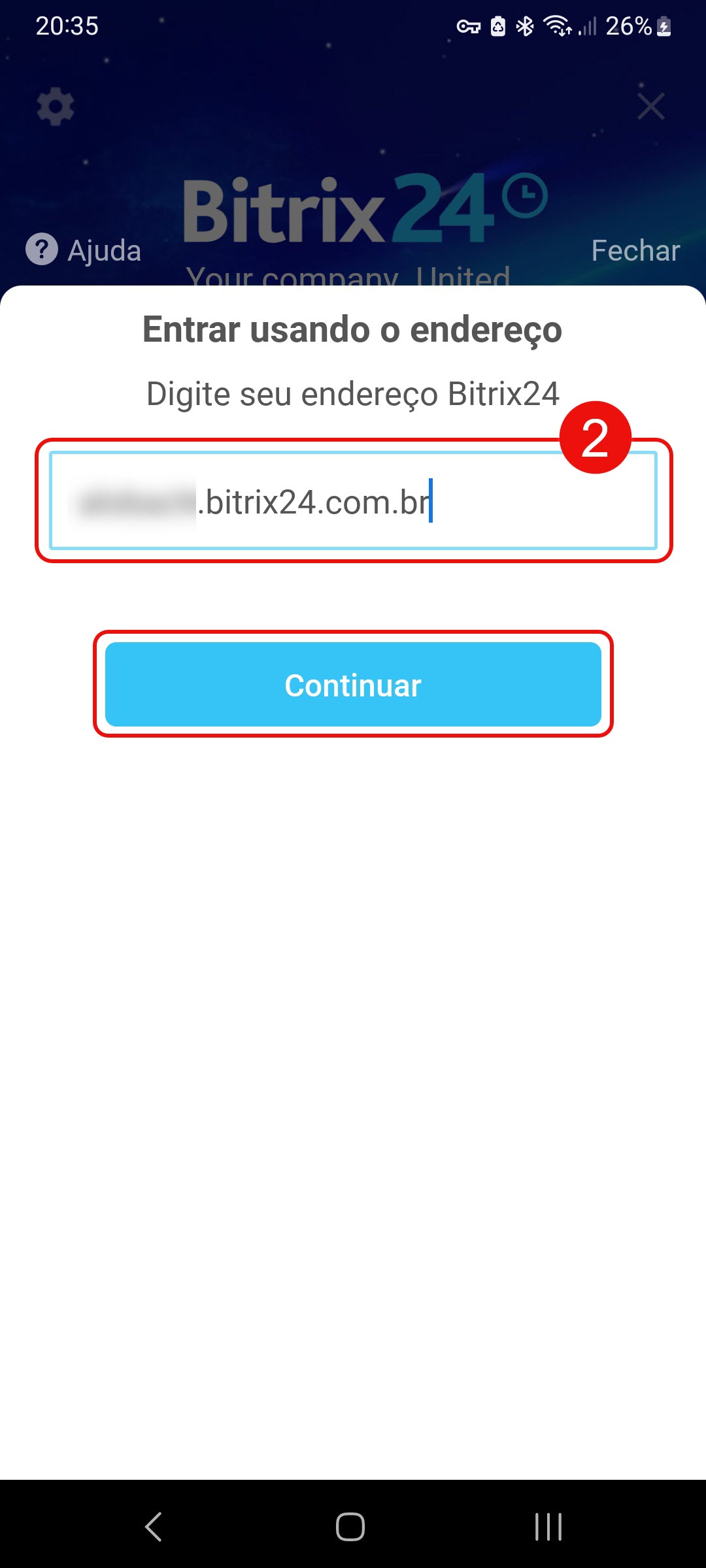 2. Digite o URL da sua conta Bitrix24, por exemplo, minhaempresa.bitrix24.com. Toque em Continuar.