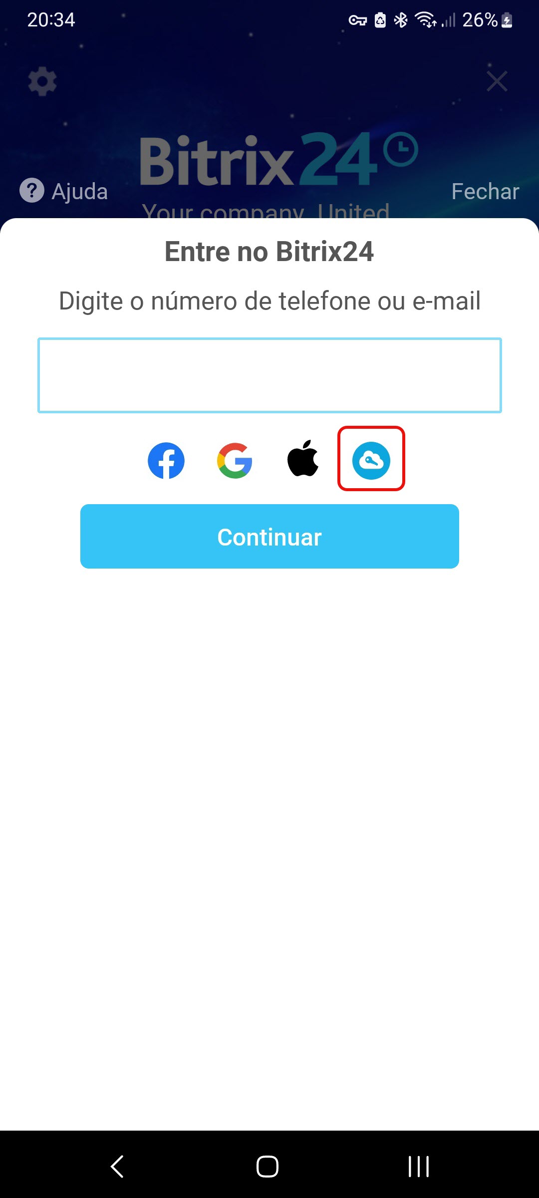 Esta tecnologia permite que os usuários façam login no Bitrix24 sem precisar digitar uma senha. Toque no ícone do SSO e digite seu e-mail corporativo.