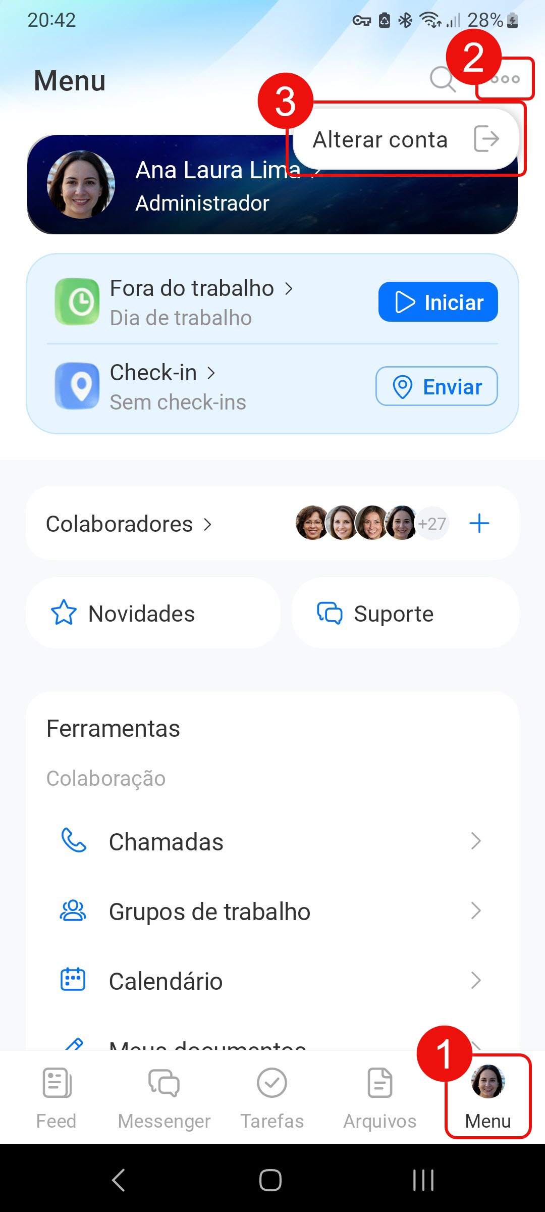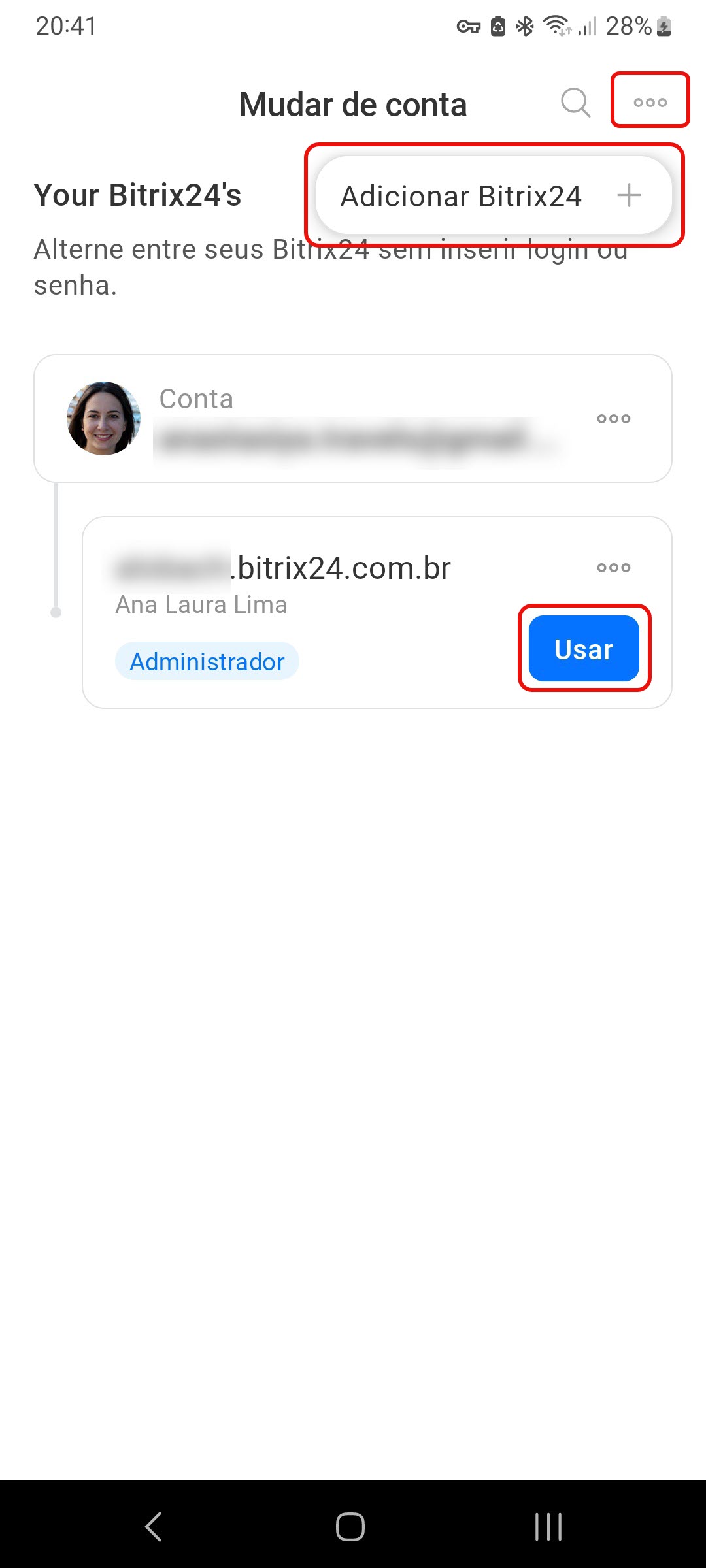 - No aplicativo móvel, você pode adicionar múltiplas contas Bitrix24 e alternar entre elas. Isso é útil se você trabalha com diferentes empresas ou projetos. Toque em Menu > Três pontos > Trocar de conta.