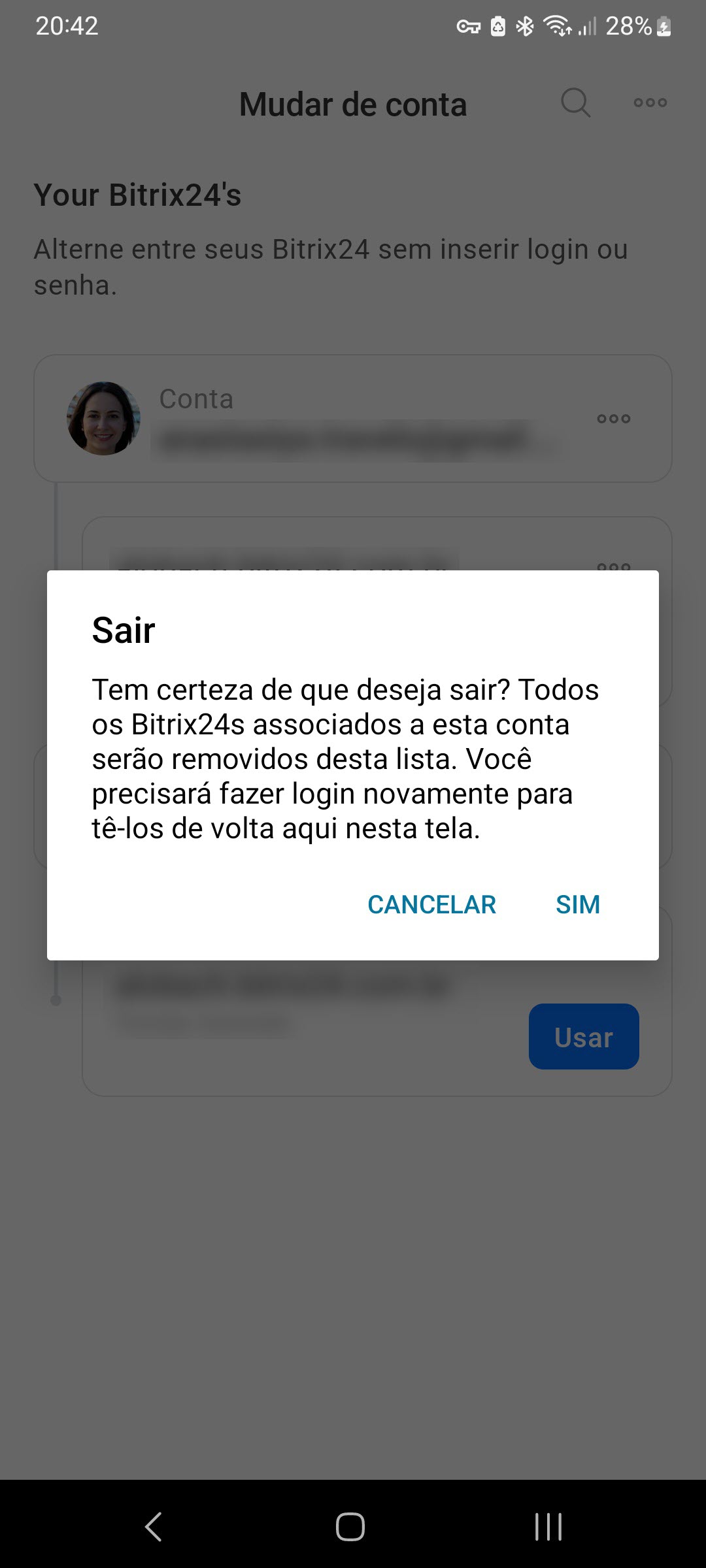 - Para remover uma conta Bitrix24 da lista, toque em Três pontos > Sair.