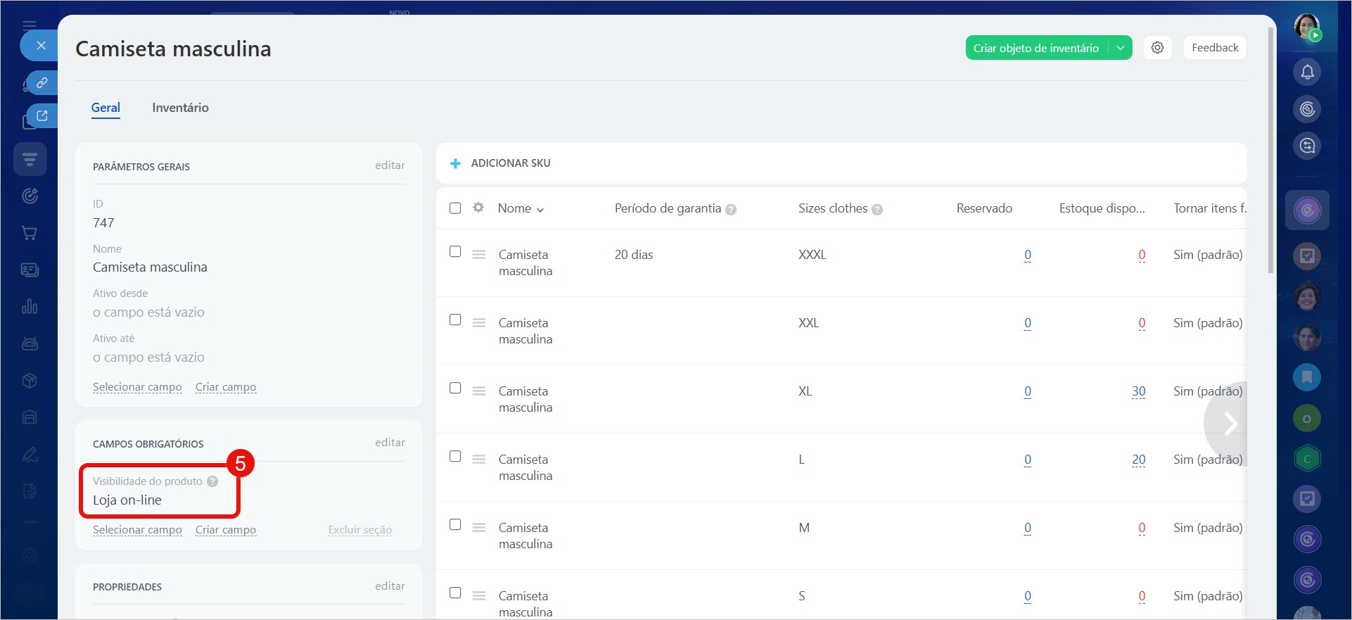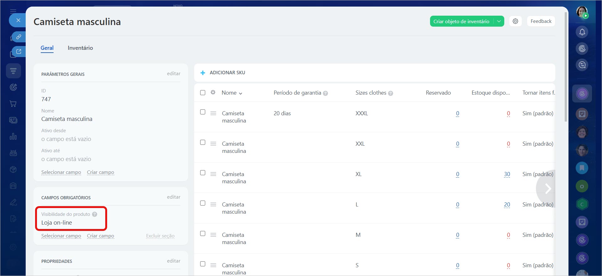 No cartão do produto, há o parâmetro Visibilidade do produto. Com ele, é possível configurar se o item será exibido na loja on-line ou permanecerá oculto para os clientes. Dessa forma, você pode esconder da loja os produtos que não devem ser vistos pelos compradores.