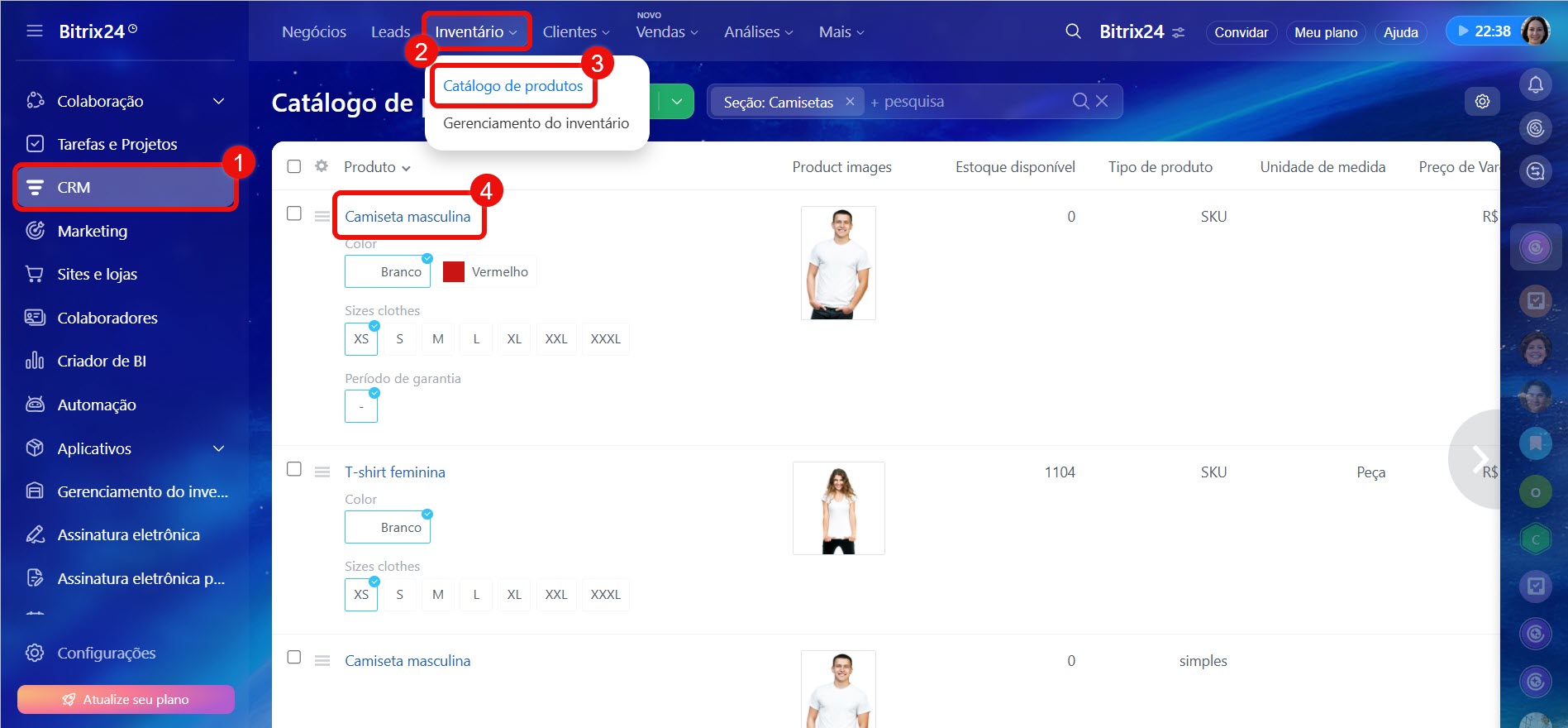 1–4. Acesse a seção CRM > Inventário > Catálogo de produtos e abra o produto desejado.