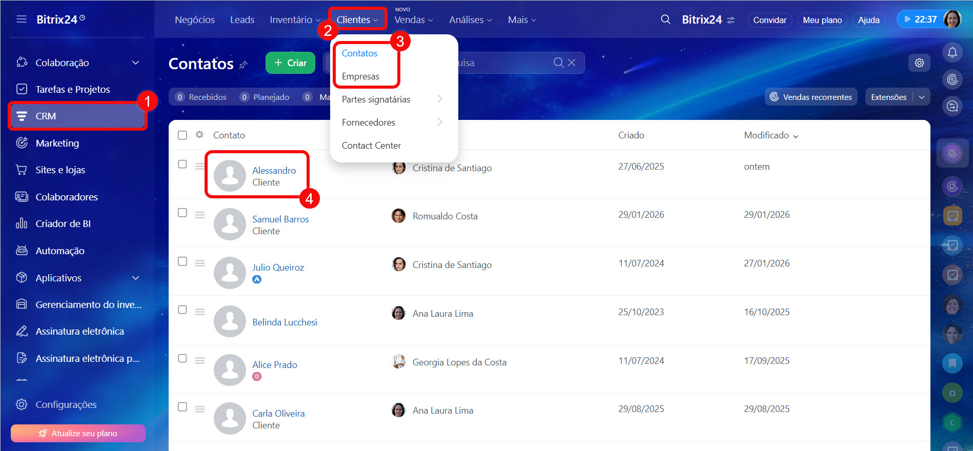 1–4. Acesse CRM > Clientes > Contatos ou Empresas e abra o cartão desejado.