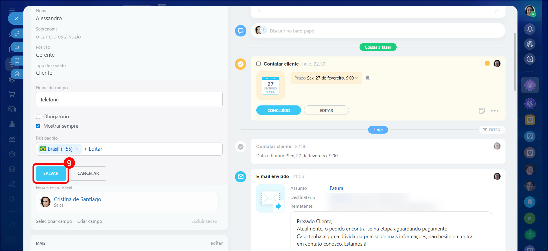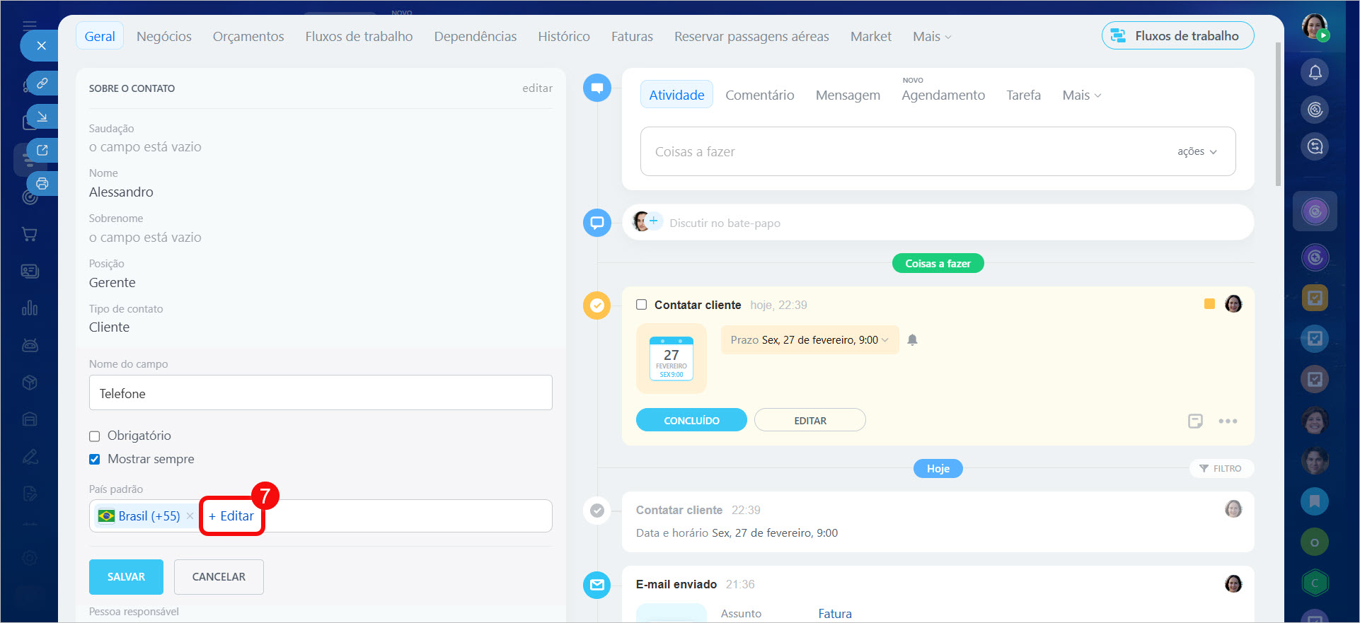 - Se você raramente trabalha com clientes estrangeiros, não é necessário alterar o país padrão; basta selecionar o código diretamente no campo Telefone no cartão específico, clicando na bandeira.