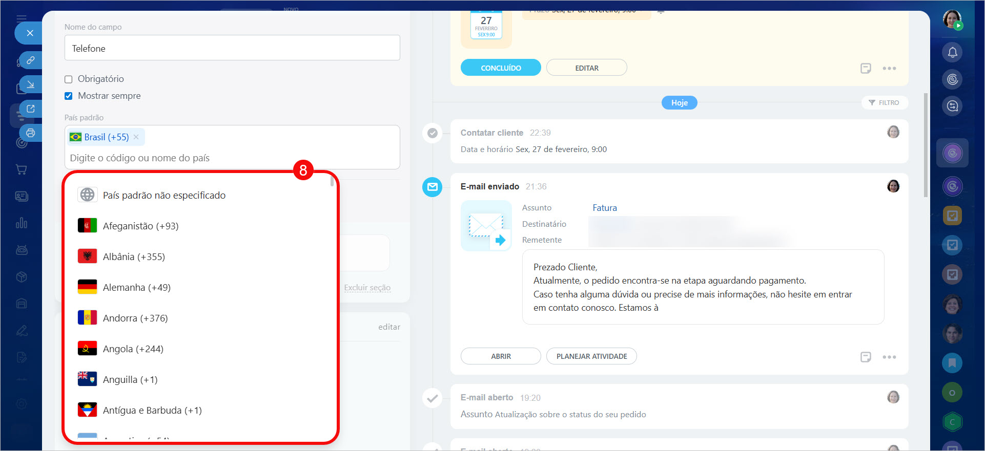Se você raramente trabalha com clientes estrangeiros, não é necessário alterar o código de país padrão; basta selecioná-lo no cartão do cliente específico. Por exemplo, você tem um negócio no Brasil e um dos seus clientes está no Chile. Para encontrar o código do país desejado, clique na bandeira no campo Telefone e escolha a opção na lista. O código selecionado aparecerá apenas no cartão deste cliente.