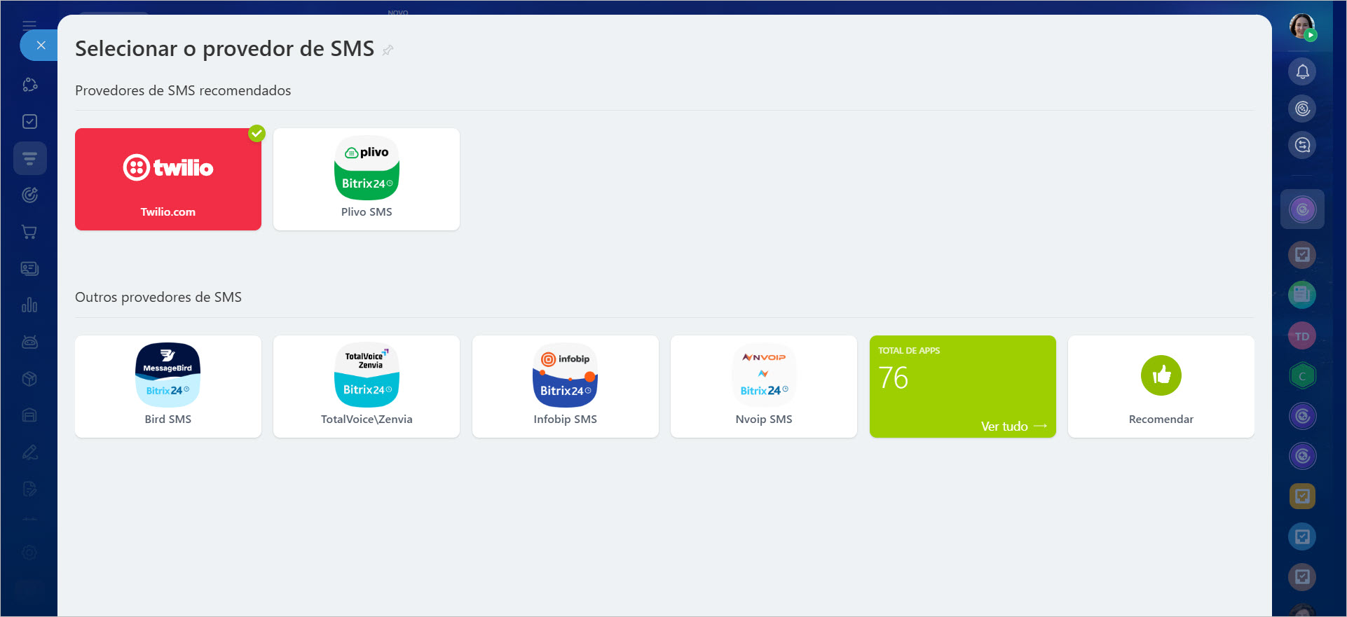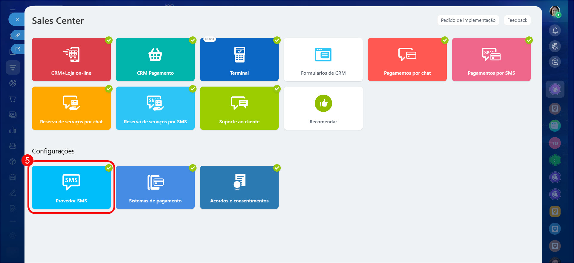 Se você ainda não conectou um provedor de SMS, isso pode ser feito na seção CRM > Vendas > Gerenciamento de vendas > Sales Center > Provedor de SMS.