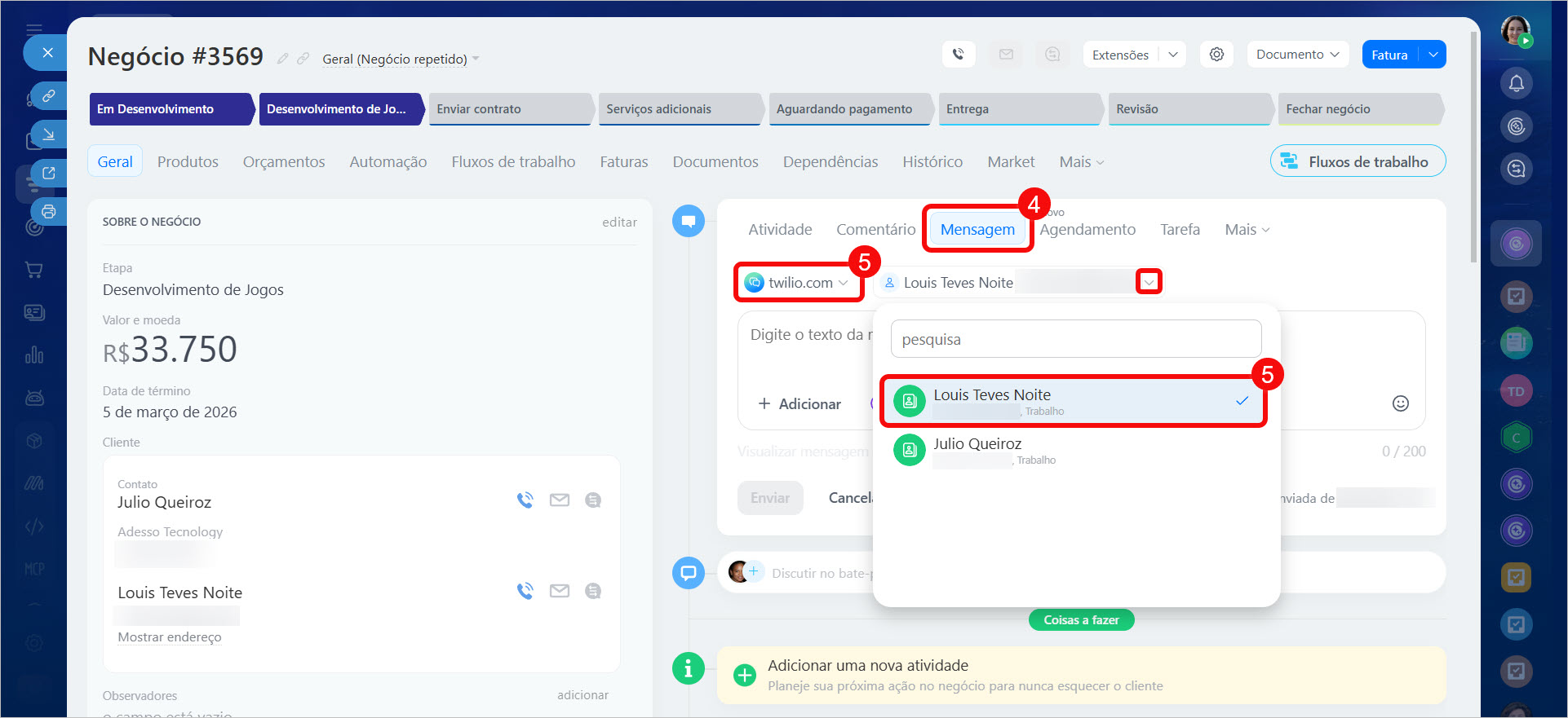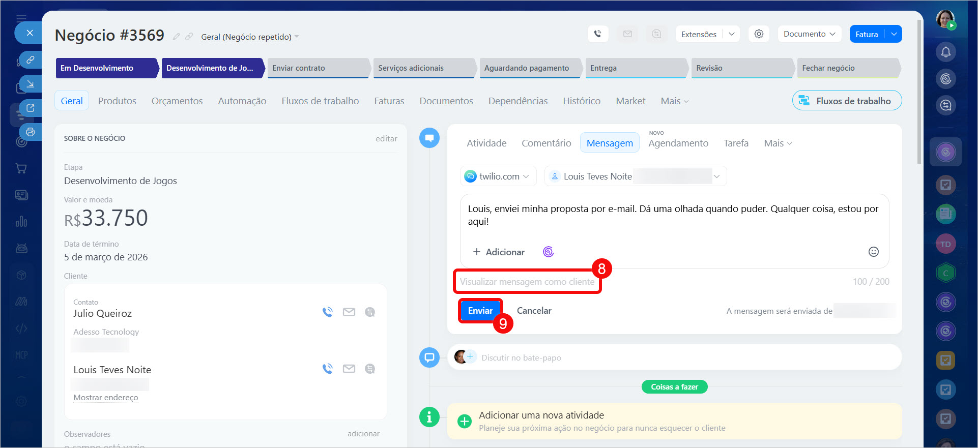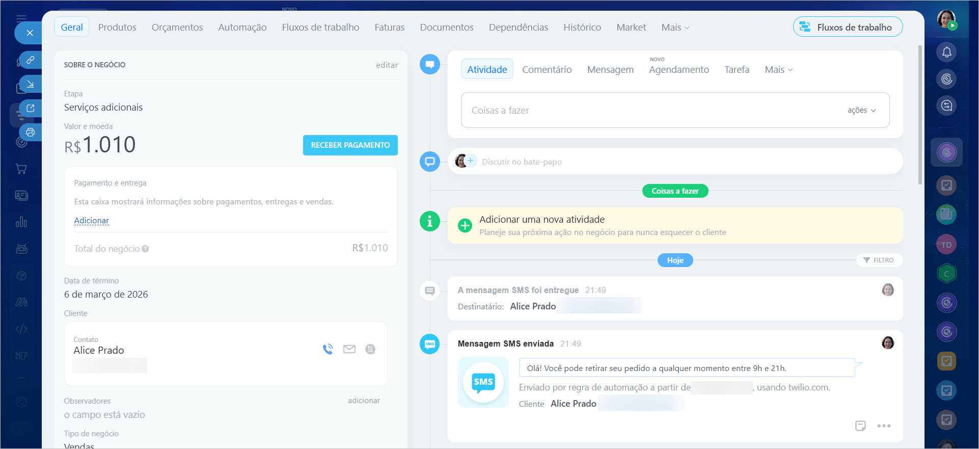 Assim que você mover o negócio para a etapa configurada, a regra de automação será acionada e o cliente receberá o SMS.