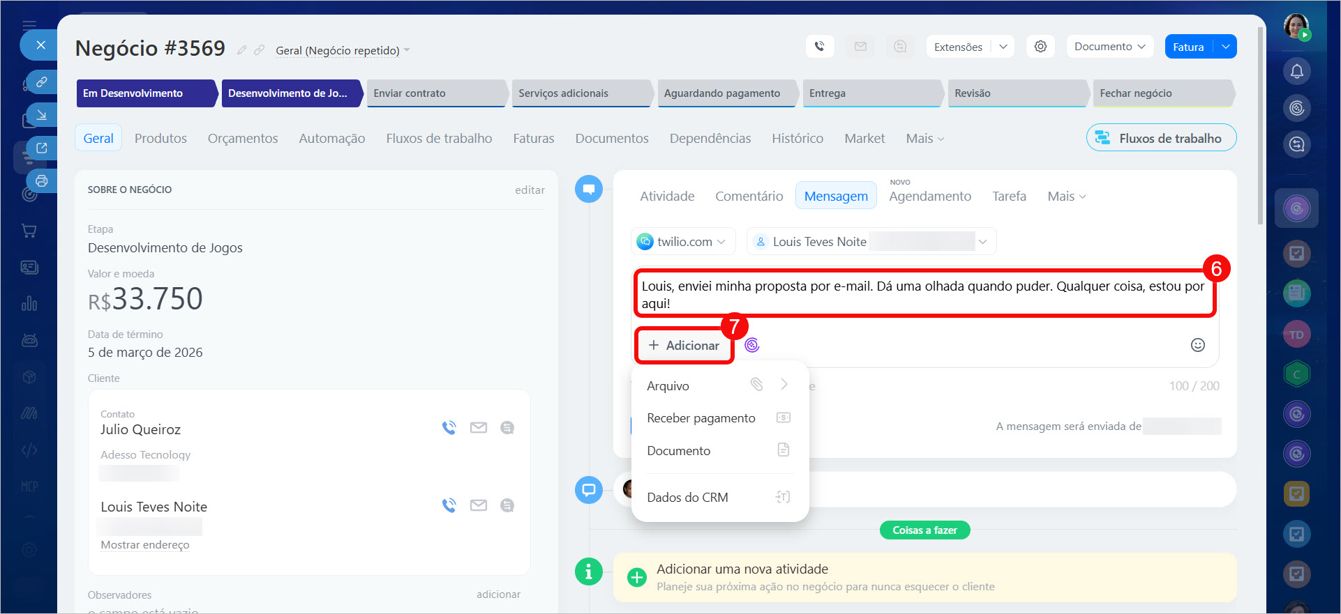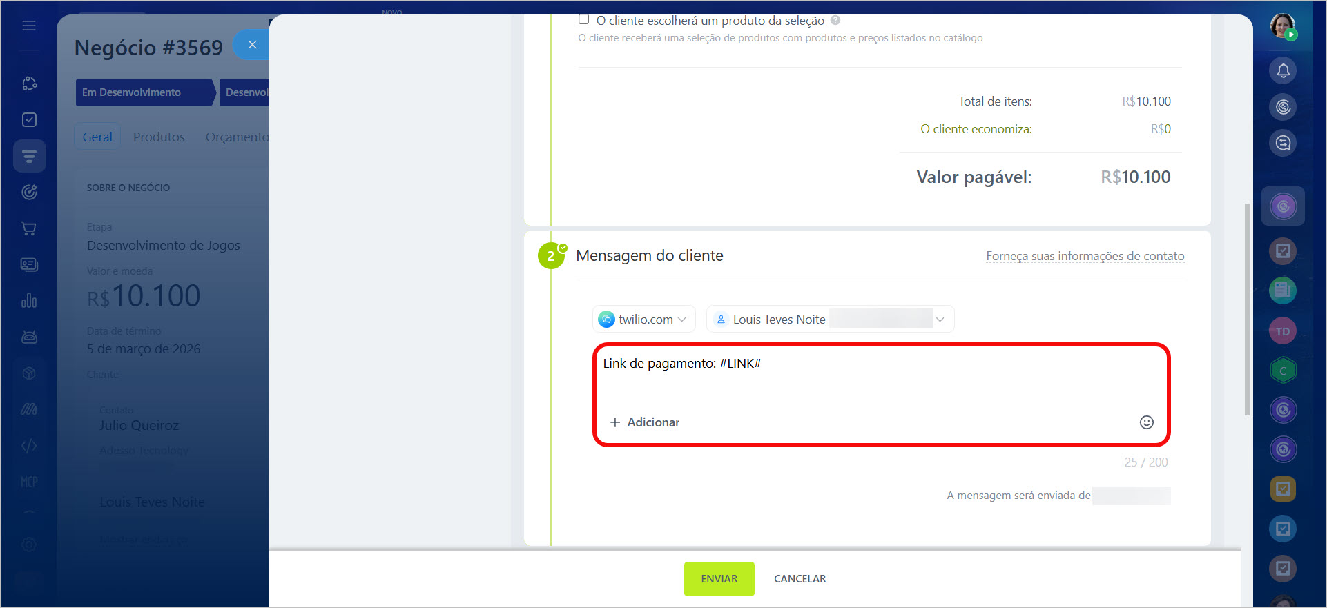 Na mensagem, é possível enviar um link para pagamento de um produto ou serviço. Por exemplo, uma empresa que vende autopeças. O gerente recebe uma ligação de um cliente, cria um negócio, adiciona os produtos e pode enviar um link de pagamento diretamente do cartão.