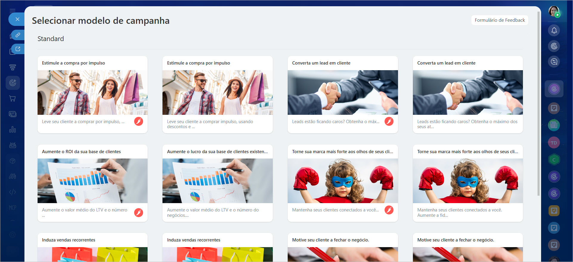 As campanhas podem ser de diversos tipos: desde promoções até felicitações. Escolha um modelo pronto ou crie o seu próprio.